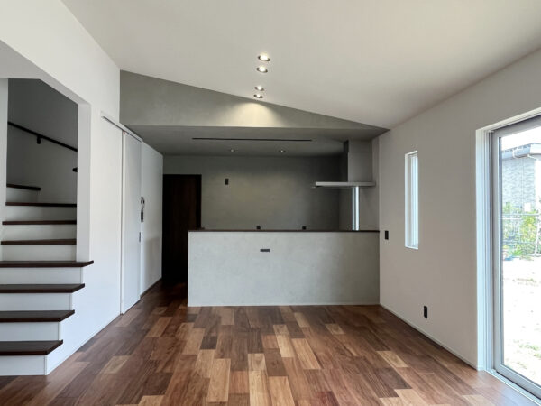 シックなグレーの外壁に木目の玄関がアクセントになった外観です。 梁が見えるLDK。スポットライトやキッチンのペンダントライトがおしゃれな明かりを演出します。 隠れ家のような書斎。 […]