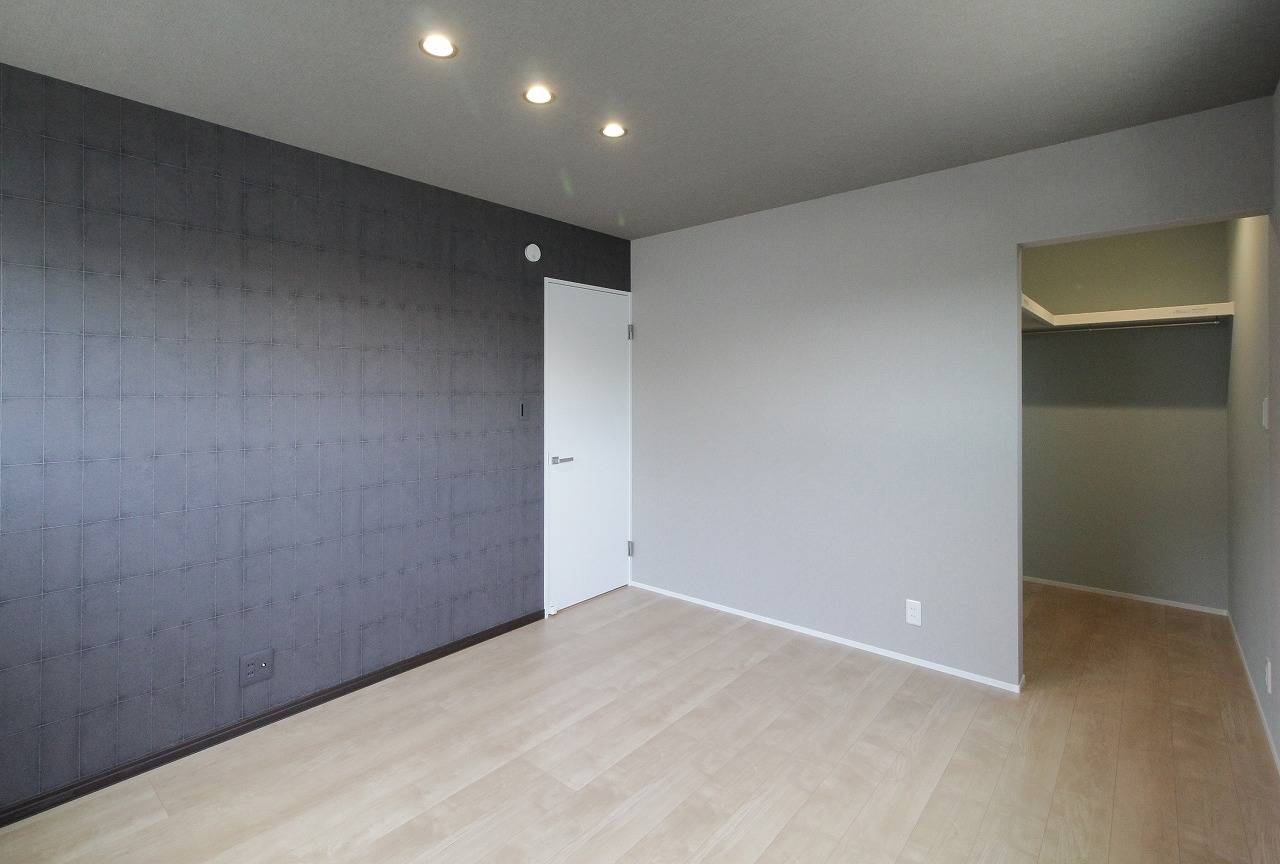 グレーの壁紙で統一した、ウォークインクローゼットのある主寝室。