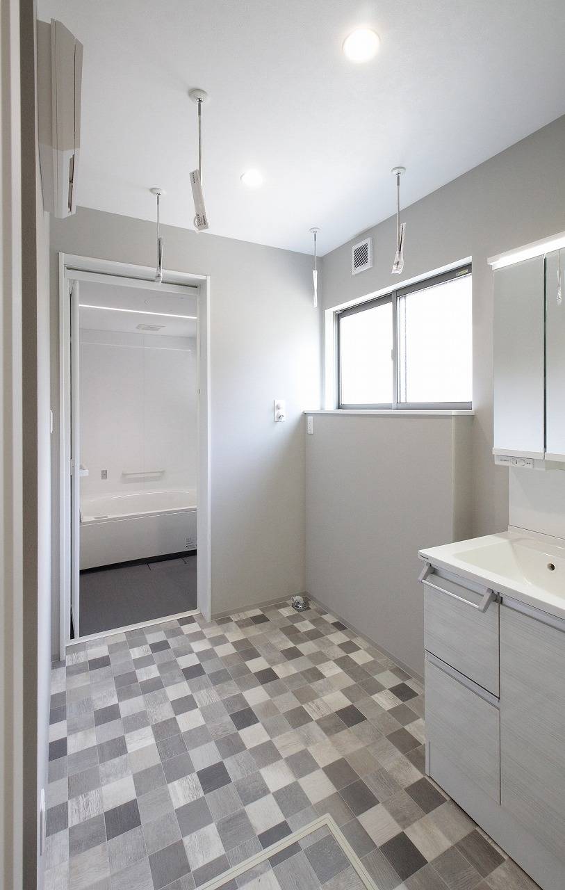 奥様が選んだ洗面脱衣室のクッションフロア【アルベロタイル】。高級感があって人気です。