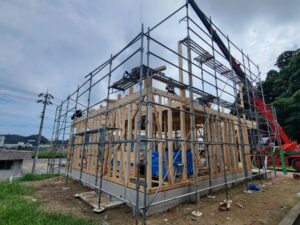 福井市にてT様邸の建方でした。 営業スタッフ、現場監督、インテリアコーディネーターが立ち会いました。 お施主さまには、建物の四隅に塩を盛り、お清めして頂きました。 柱や梁を2階の屋根部分まで組み上げたら、職人さん達が垂木 […]