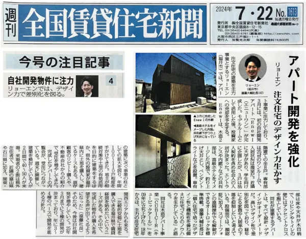 2024年7月22日発刊の全国賃貸住宅新聞に当社の記事が掲載されました。 自社開発物件に注力 リョーエンでは、デザイン力で差別化を図る!! 「今号の注目記事」として、遠藤社長がインタビューを受け、当社のアパート建築事業「 […]