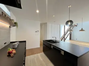 白の外壁にグレーのタイル、オープンガレージが特徴的なスッキリとした外観。 大きな吹き抜けとアイアンの手すりがオシャレなシースルー階段で、明るく開放的なLDK。 広々としたアイランド型キッチン。2世代でお料理する時もスペー […]