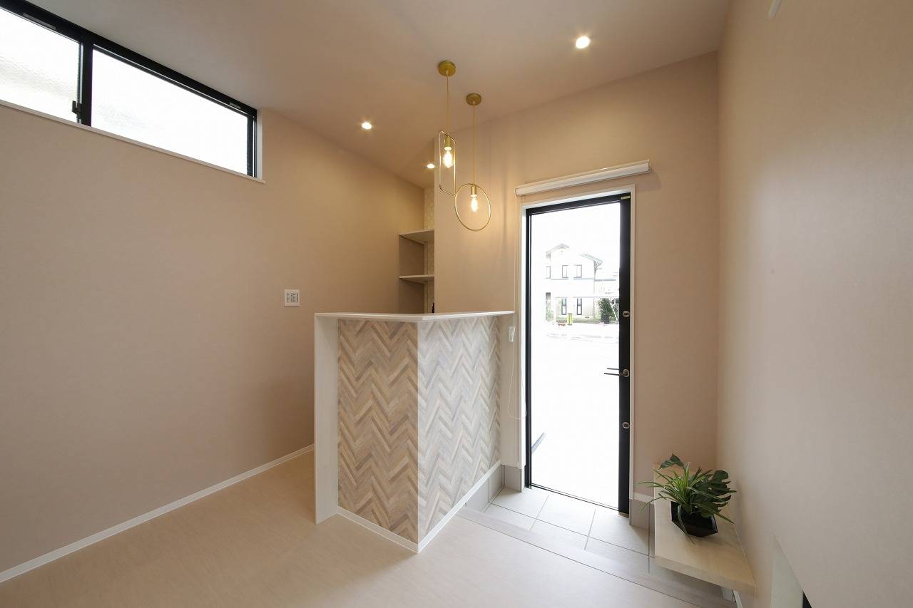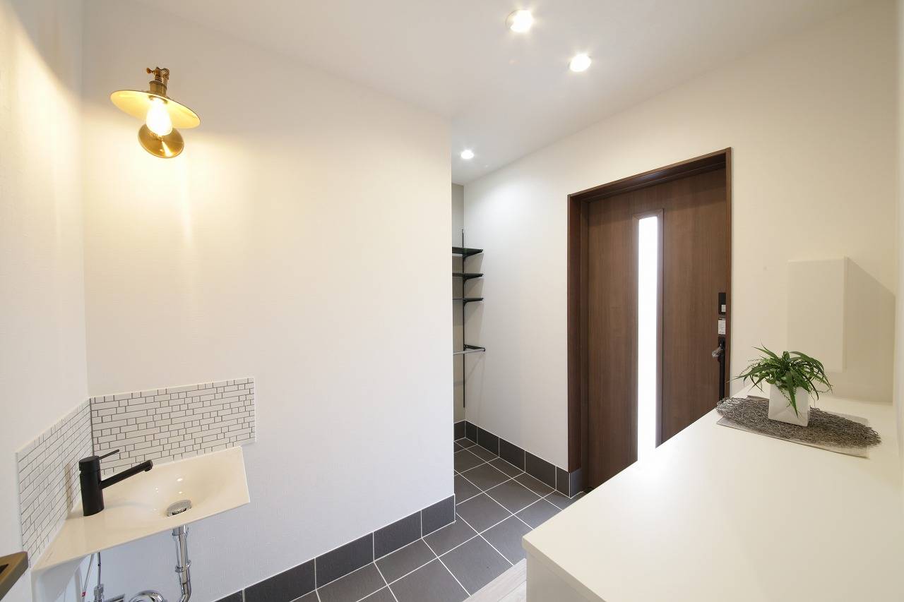 アンティークな照明がポイントの手洗い場やシューズクロークのある玄関。