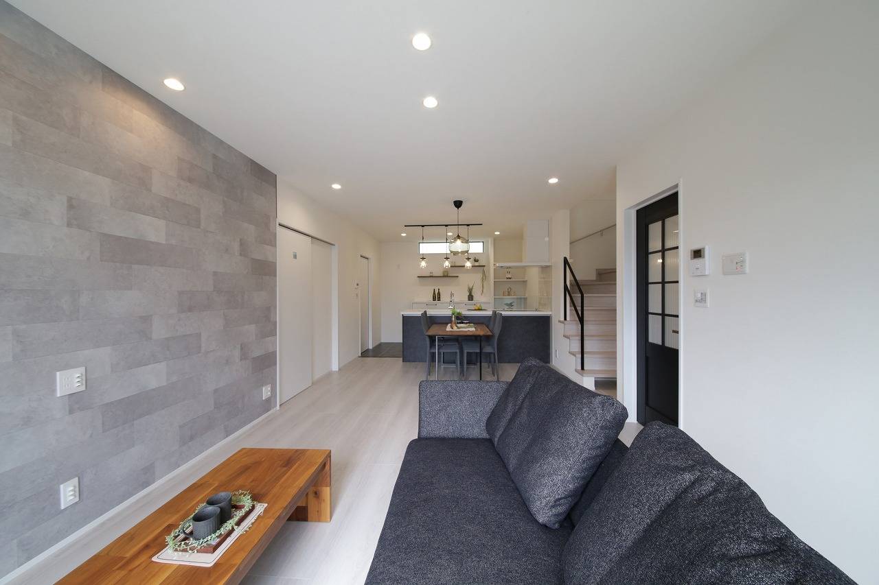 照明にこだわったLDK。飾り棚にはお気に入りの雑貨を並べて。