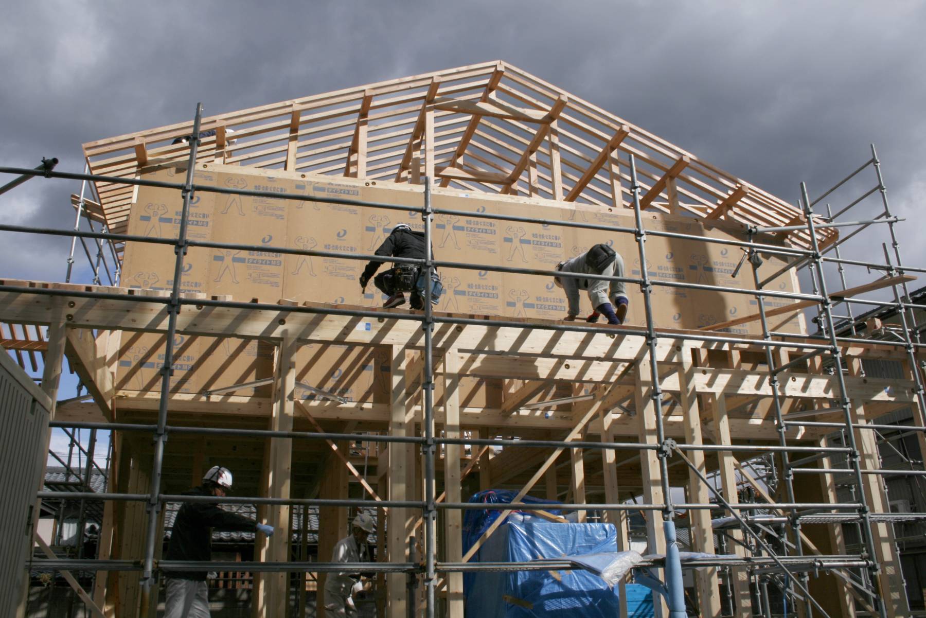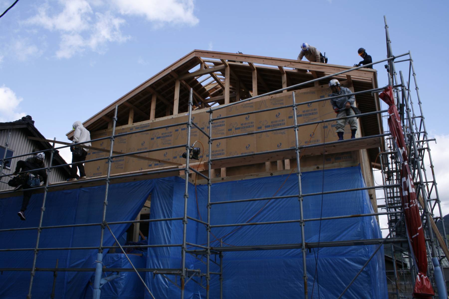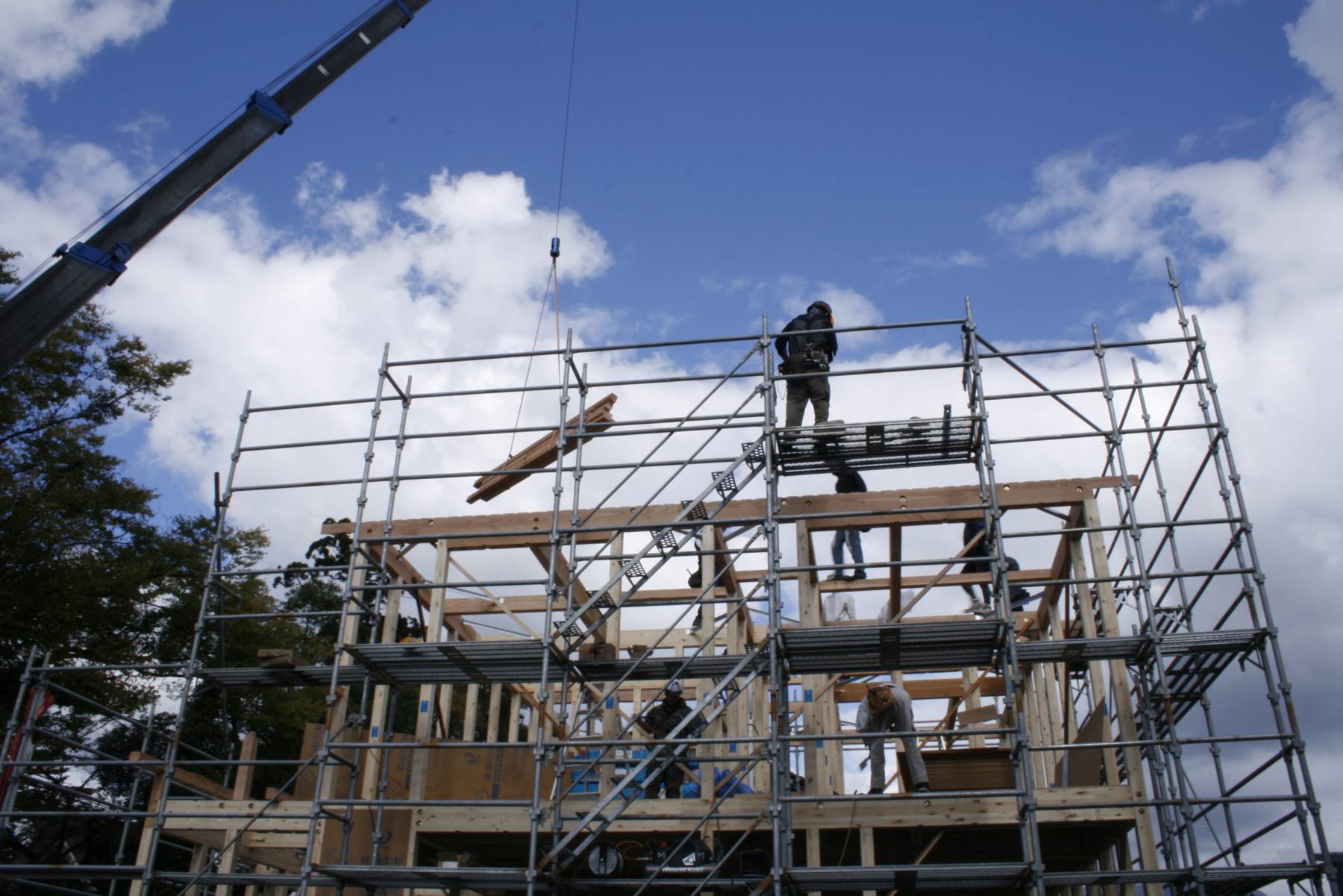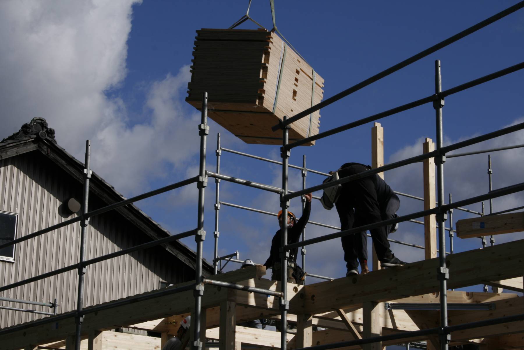 柱や梁を屋根部分まで組み上げたら、職人さん達が垂木を掛けていきます。