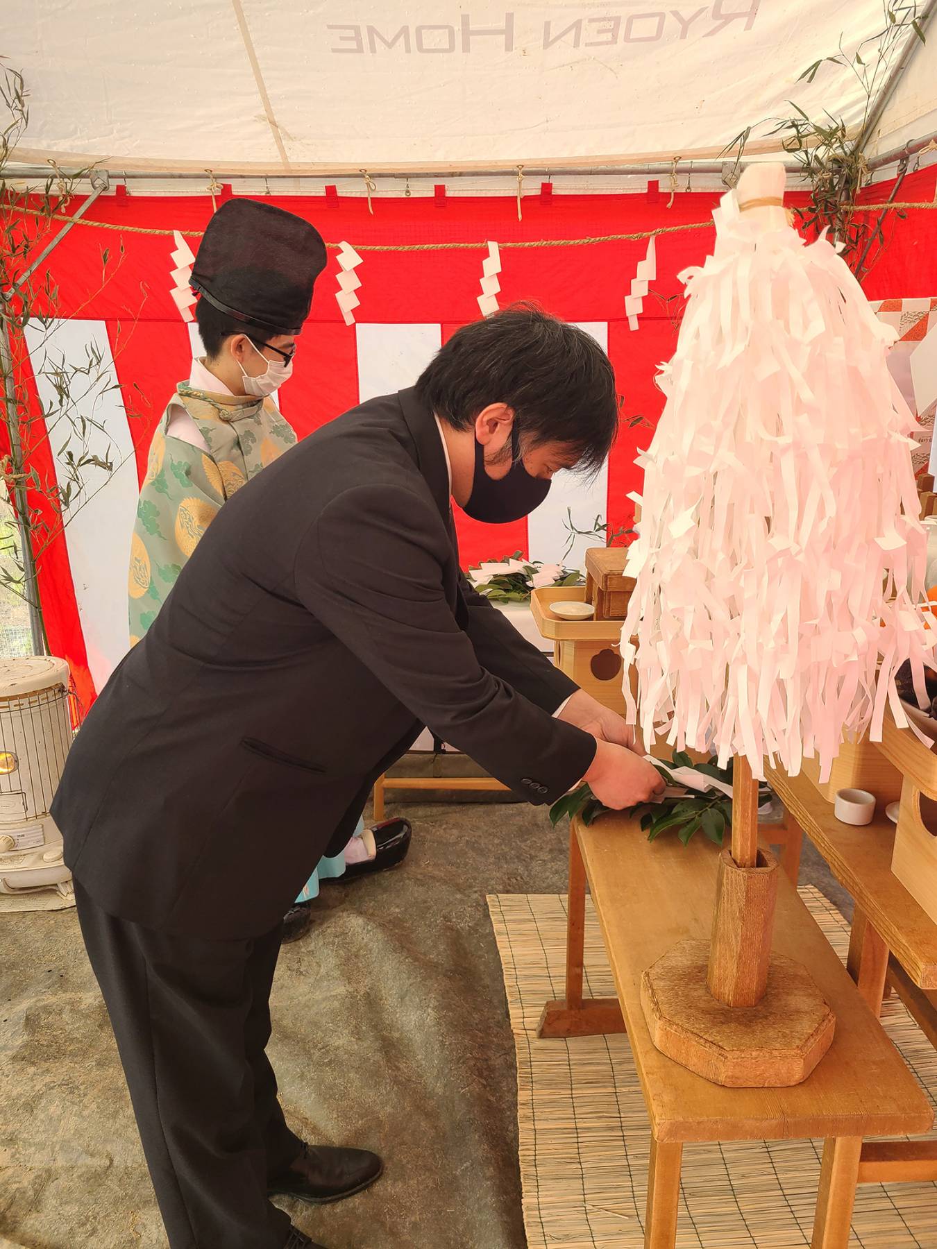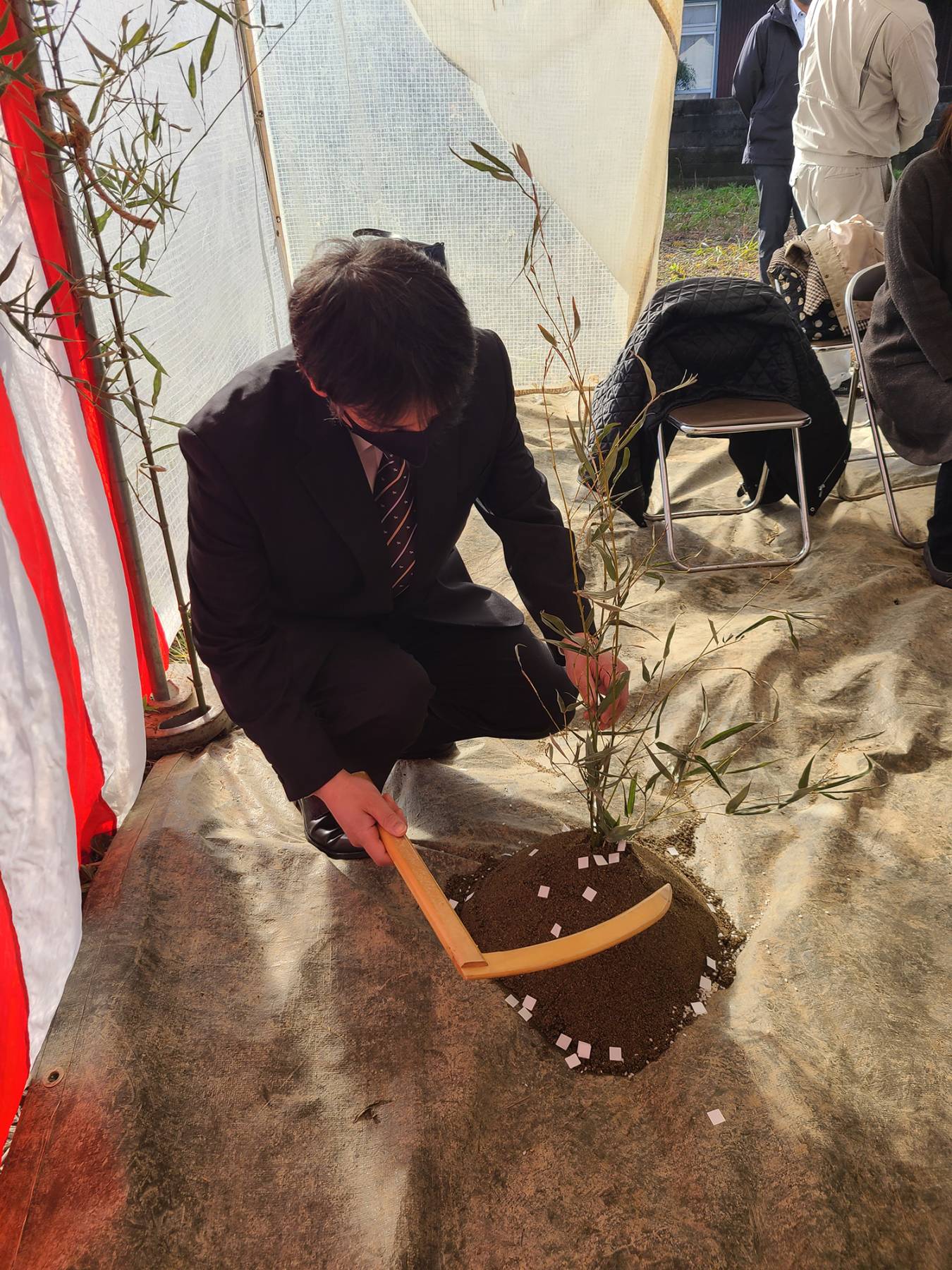お清めが済むとテントに戻り、この土地に初めて手を入れる儀式をします。