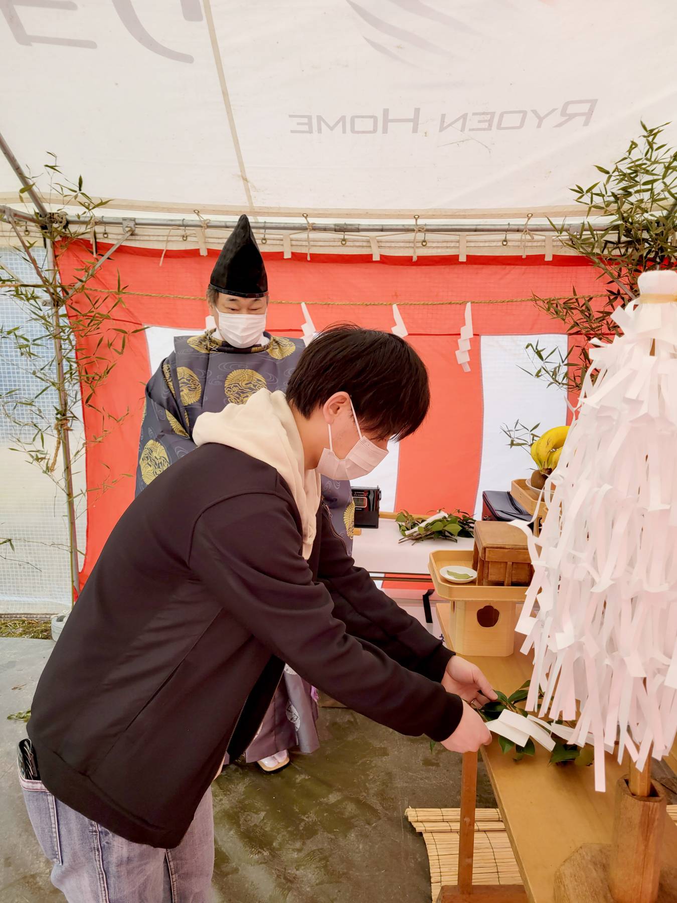 まずはこの土地の神様をお呼びする儀式を行い、建物の建つ四隅をお清めします。