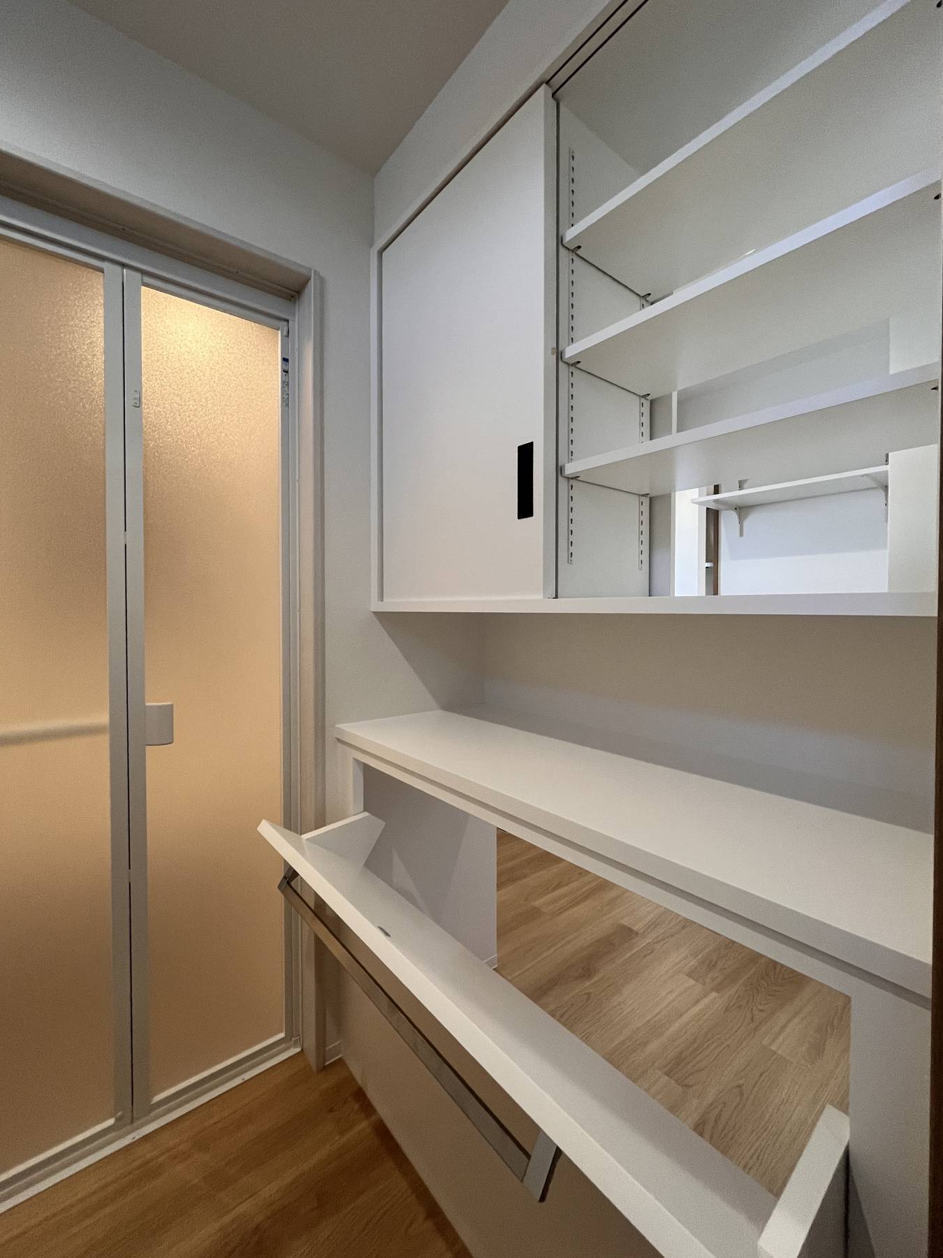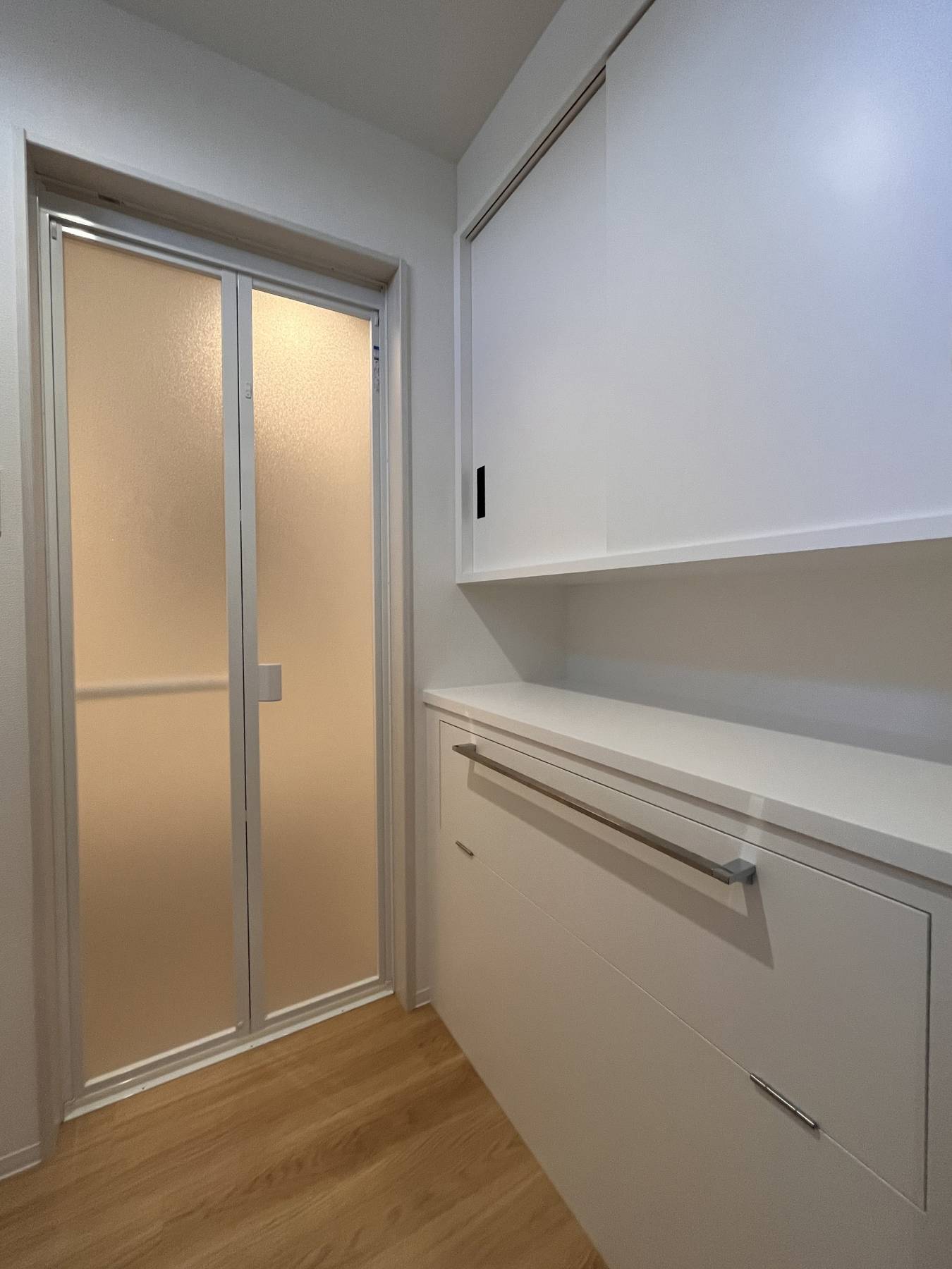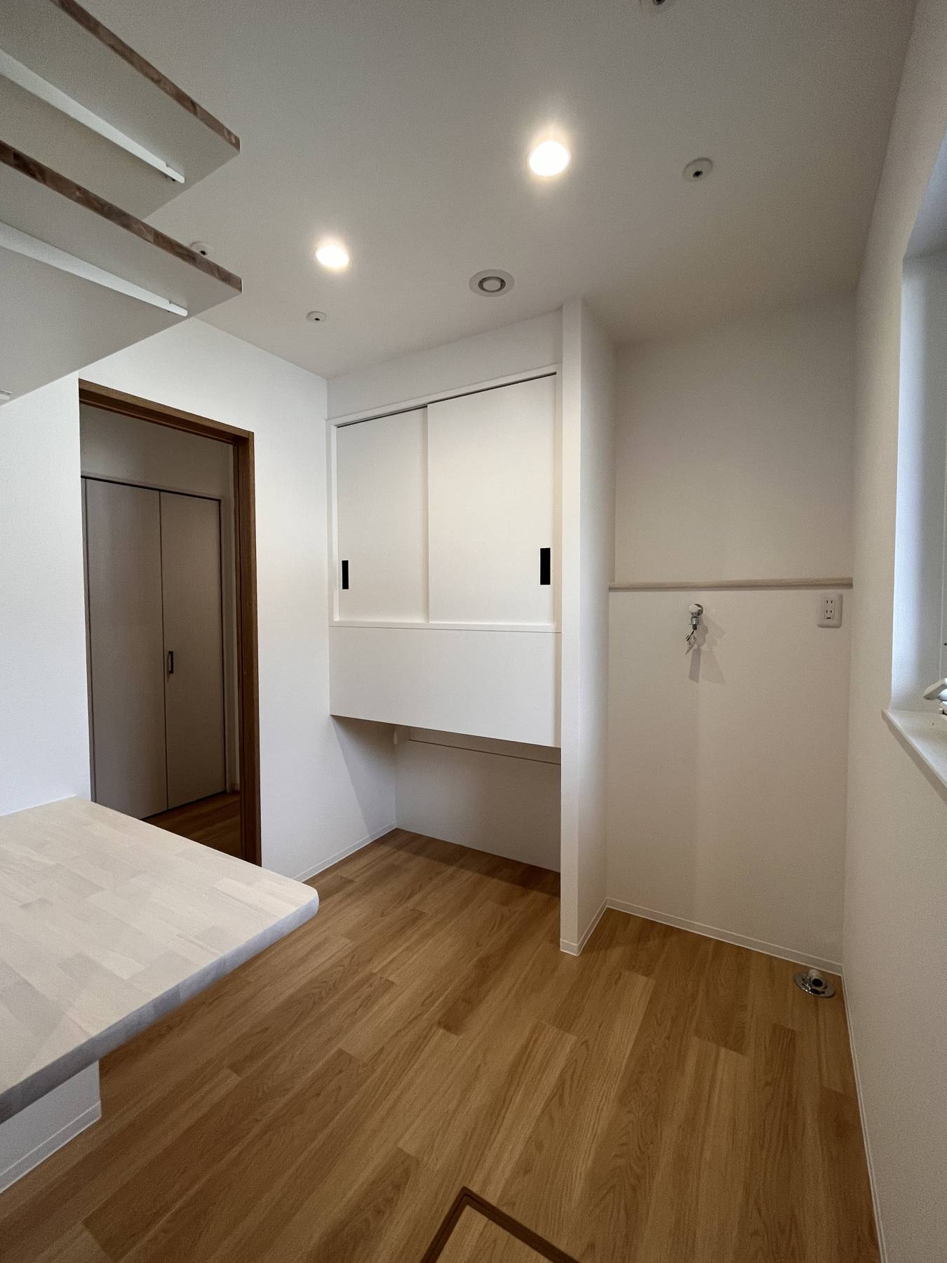 キッチンとつながるサンルームは、家事楽収納の家具を介して脱衣室側とつながり、家事楽な回遊動線を確保。