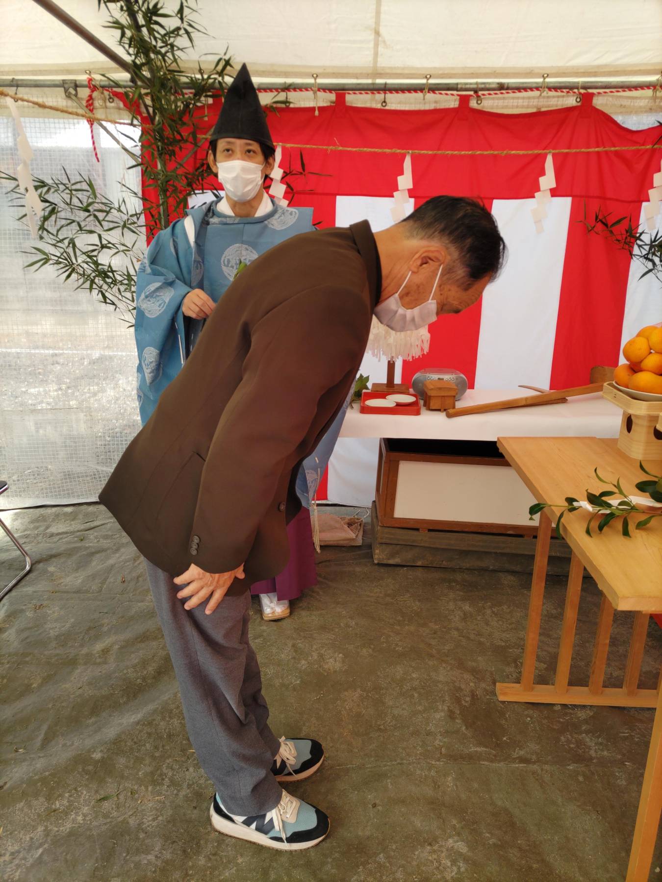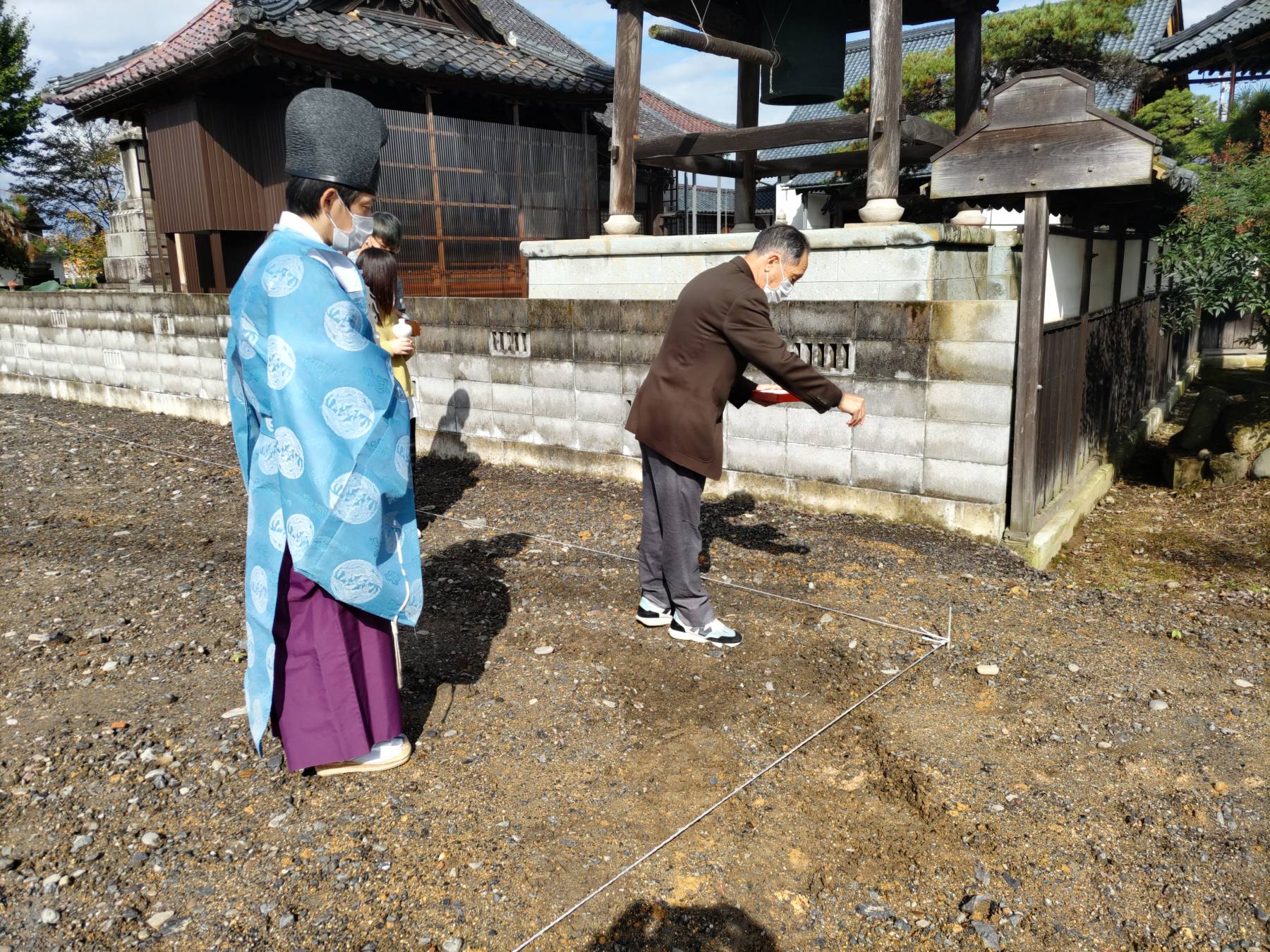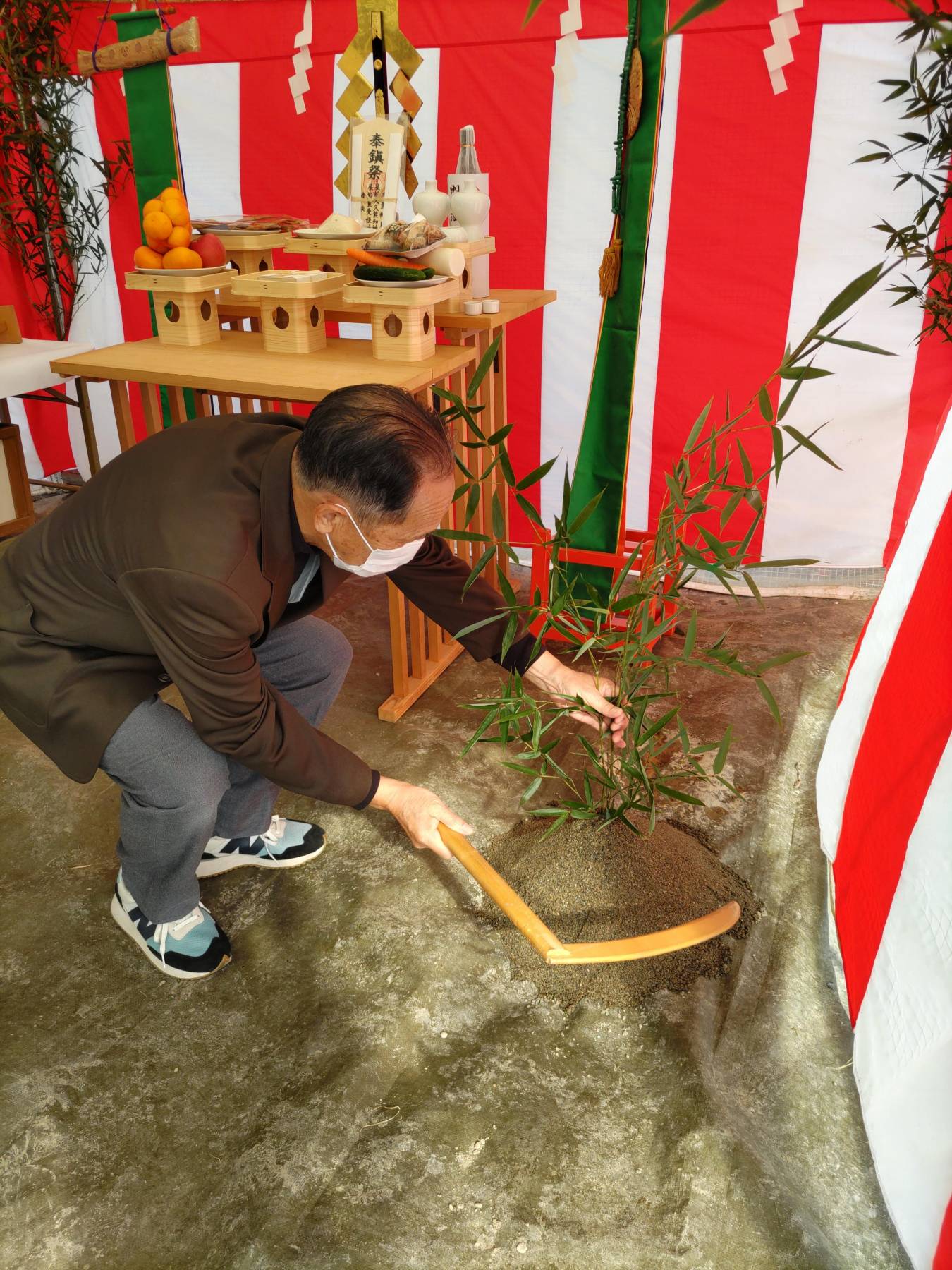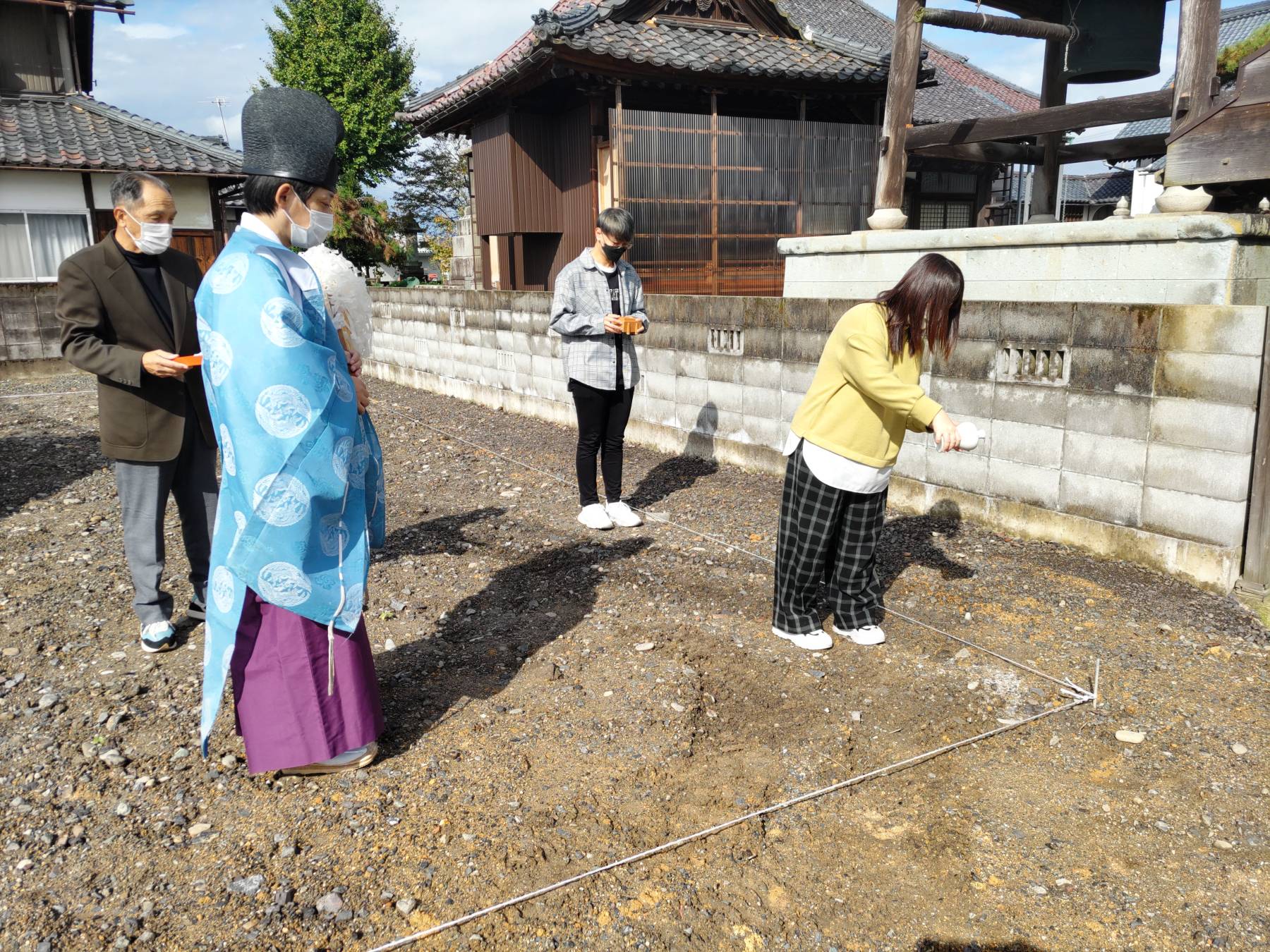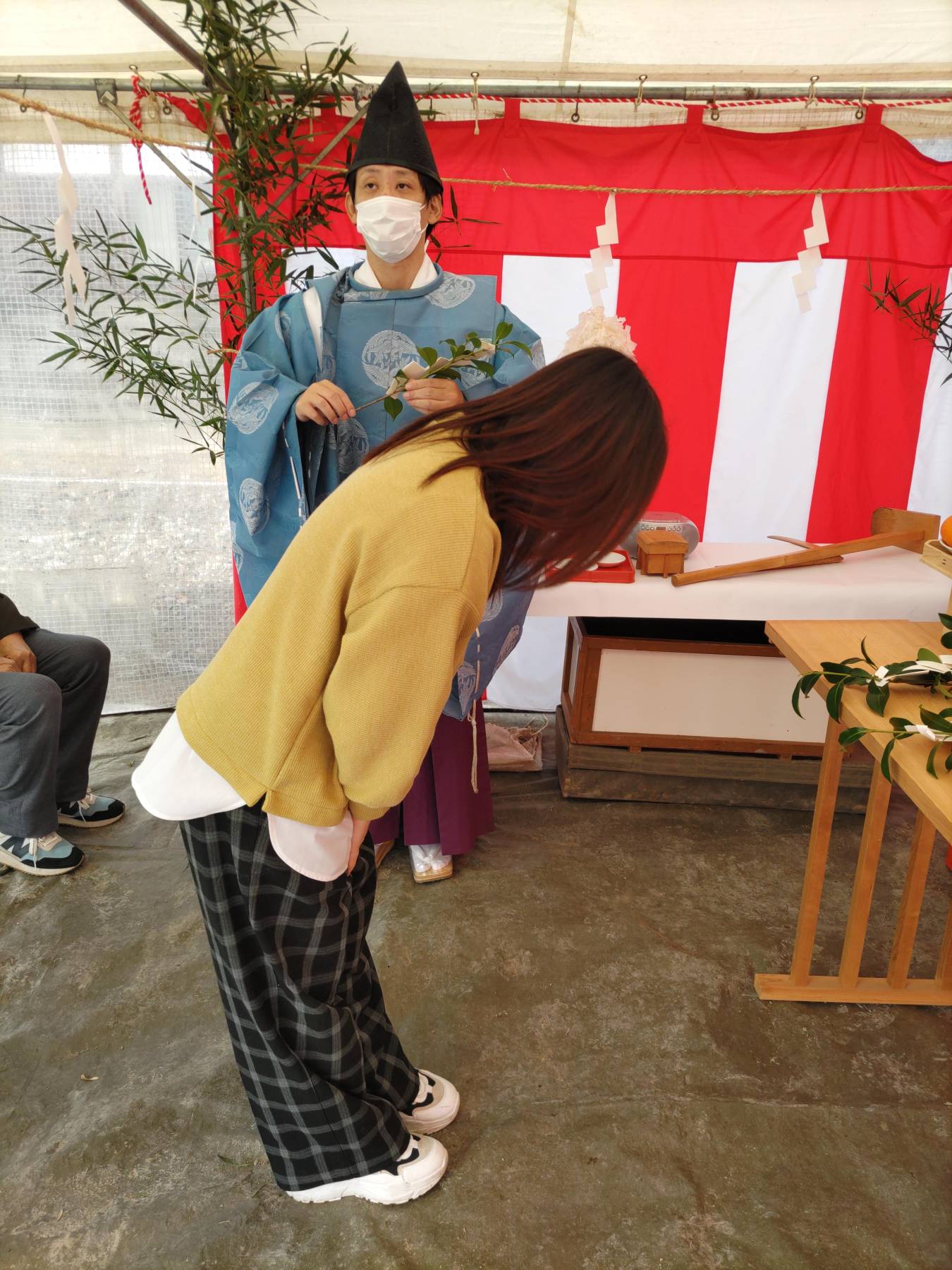 まずはこの土地の神様をお呼びする儀式を行い、建物の建つ四隅をお清めします。