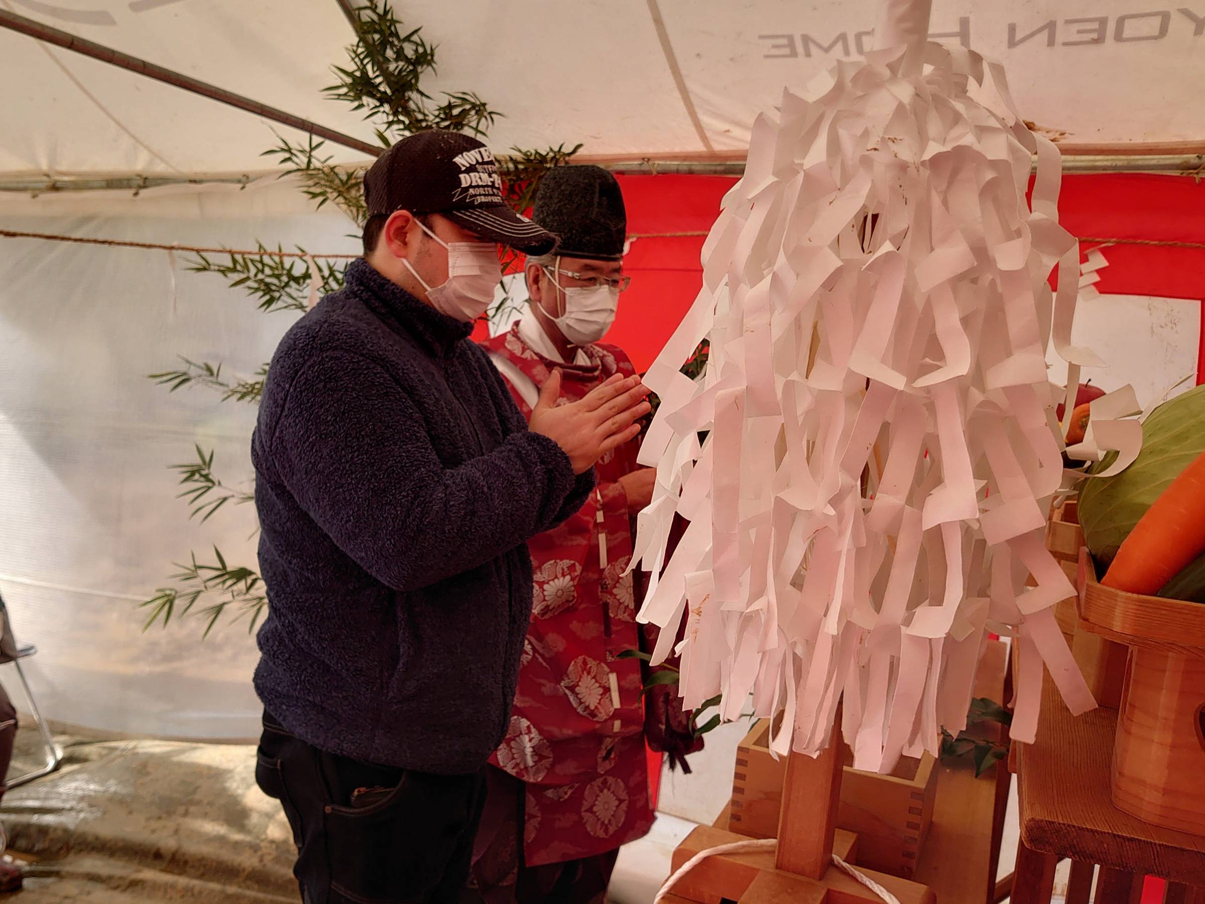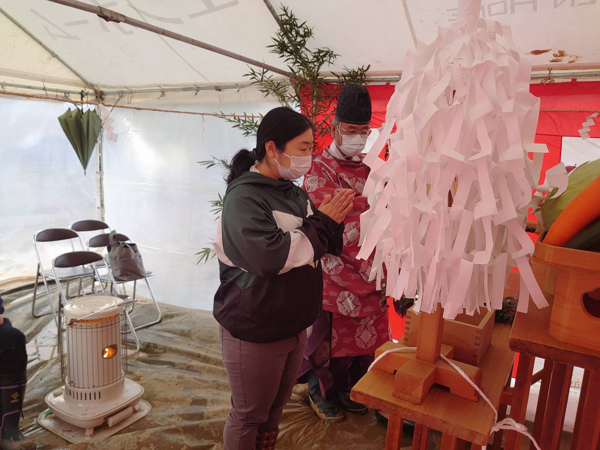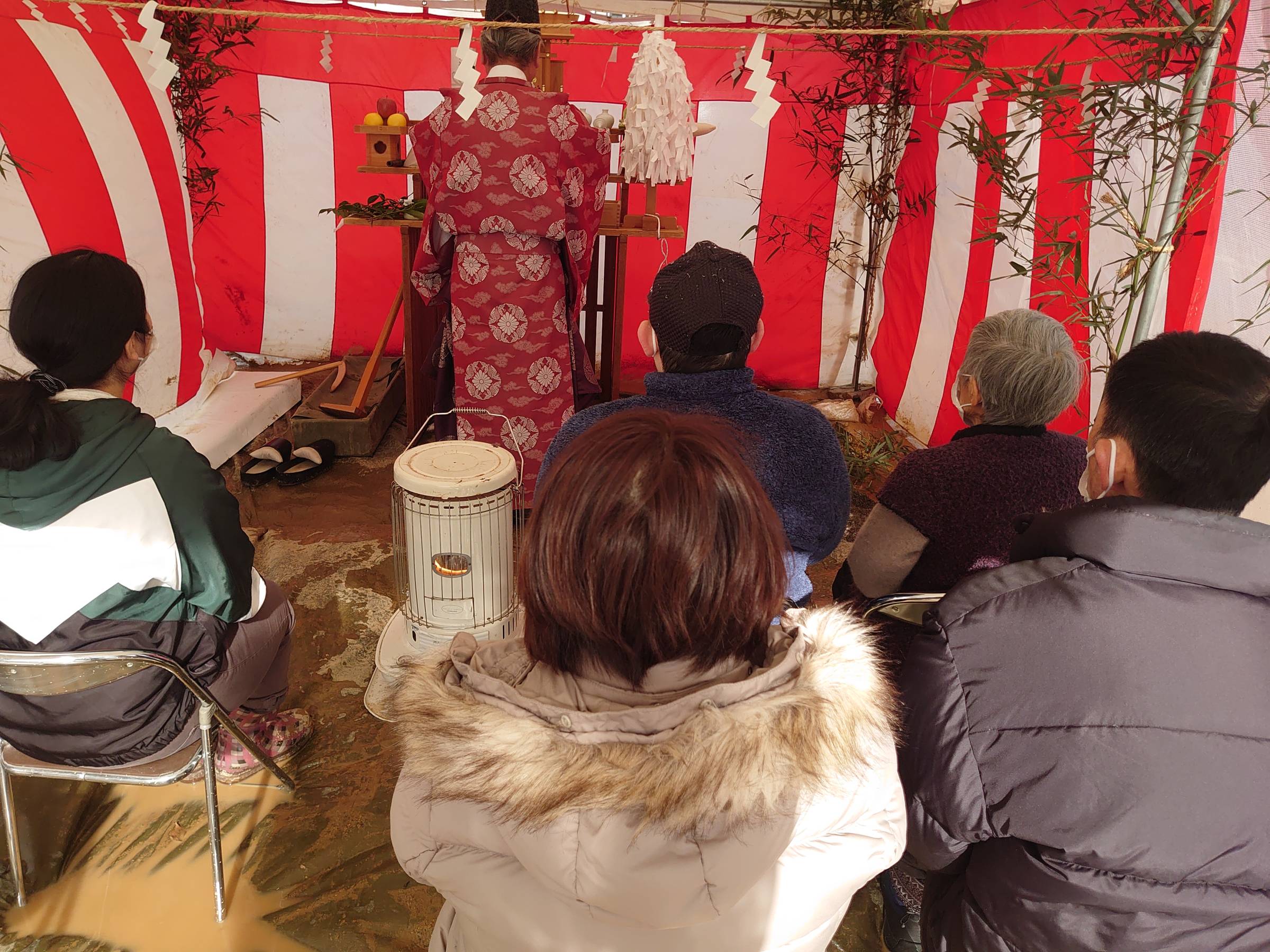 まずはこの土地の神様をお呼びする儀式を行い、建物の建つ四隅をお清めします。
