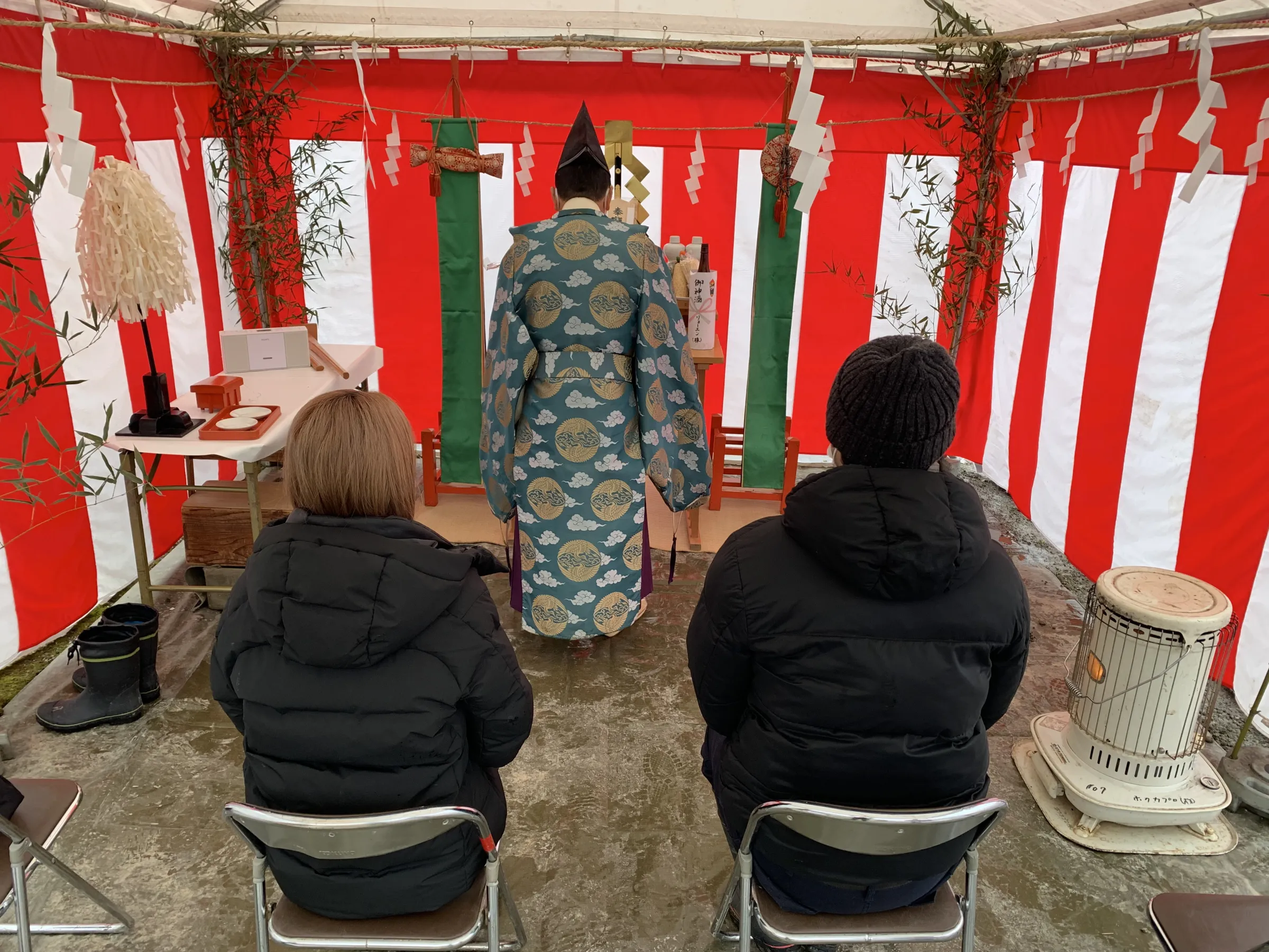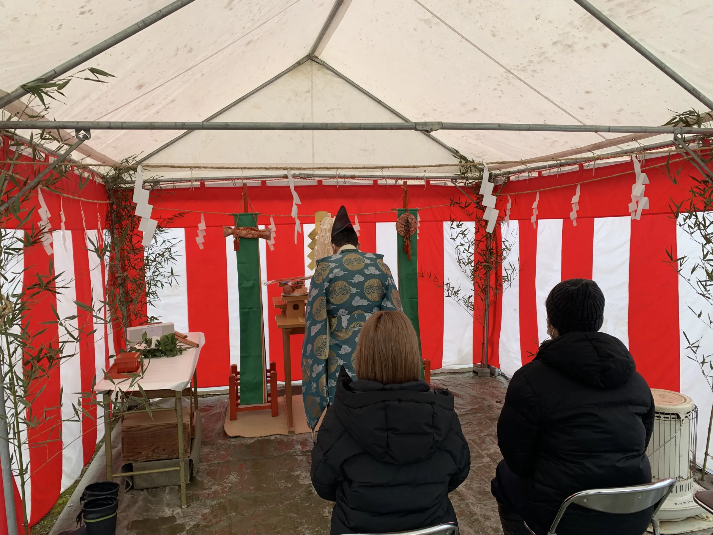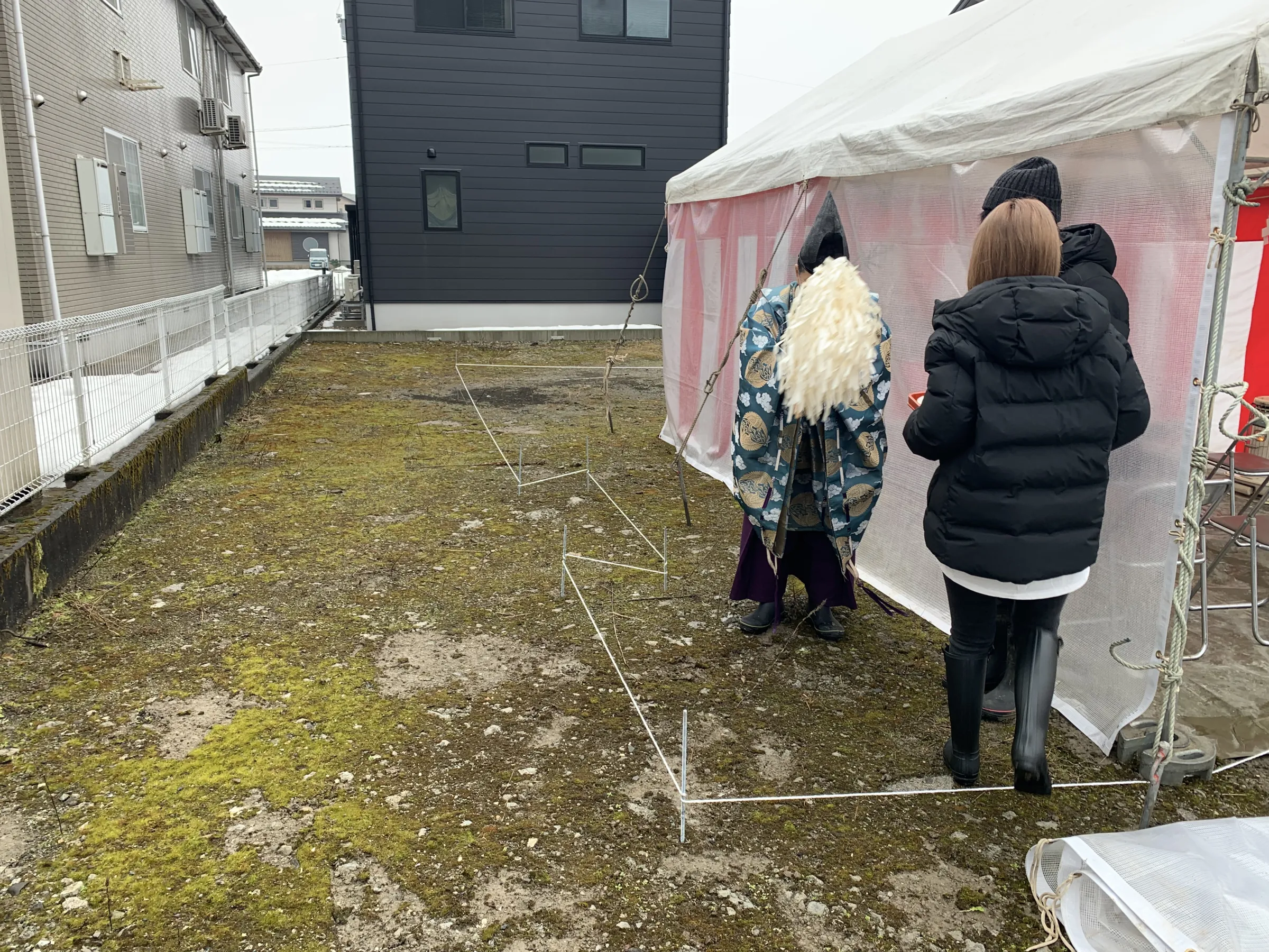 まずはこの土地の神様をお呼びする儀式を行い、建物の建つ四隅をお清めします。