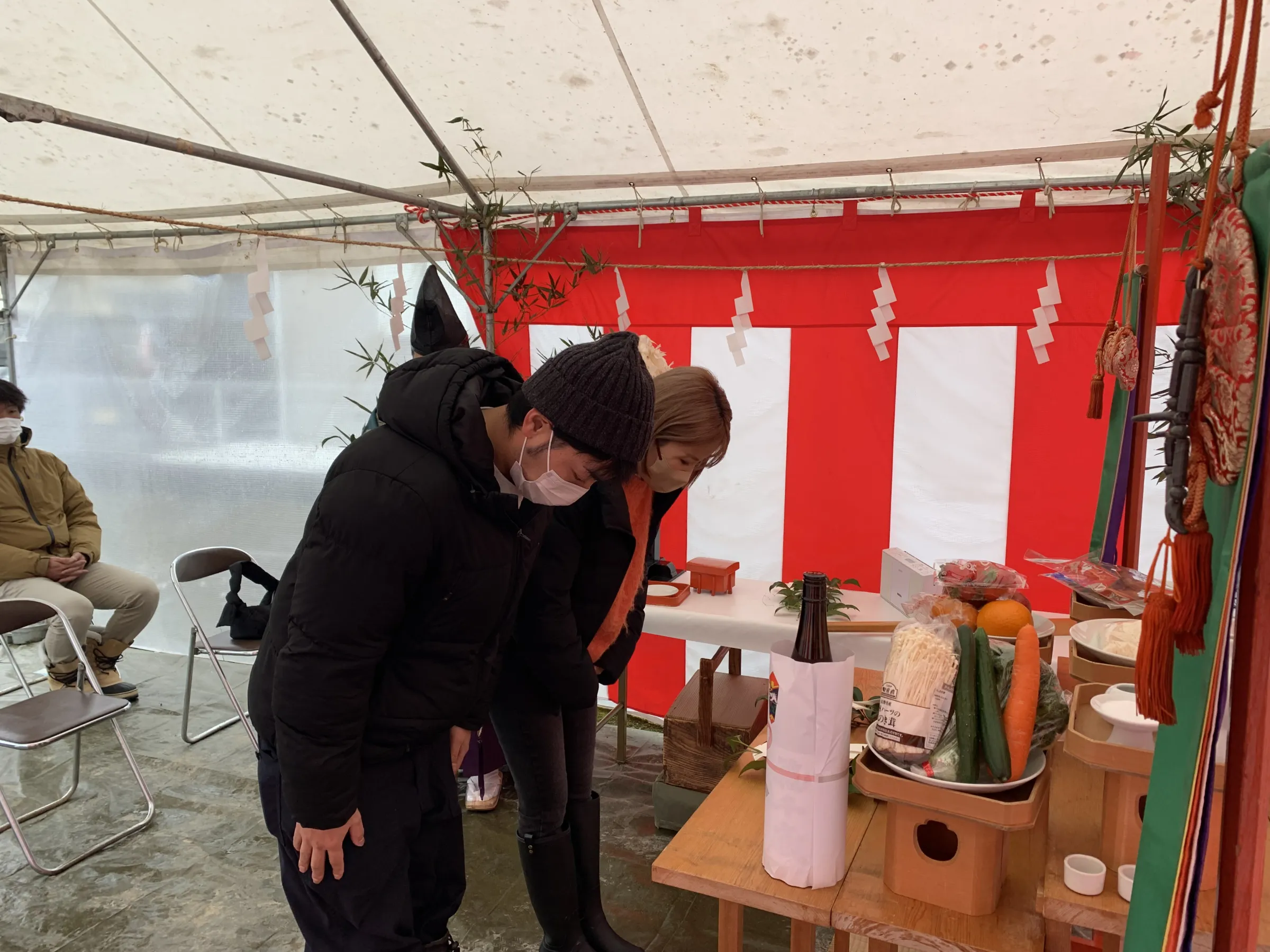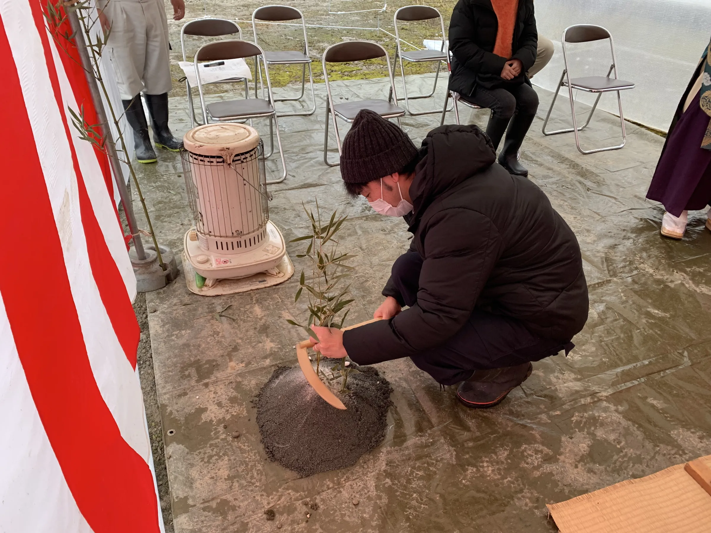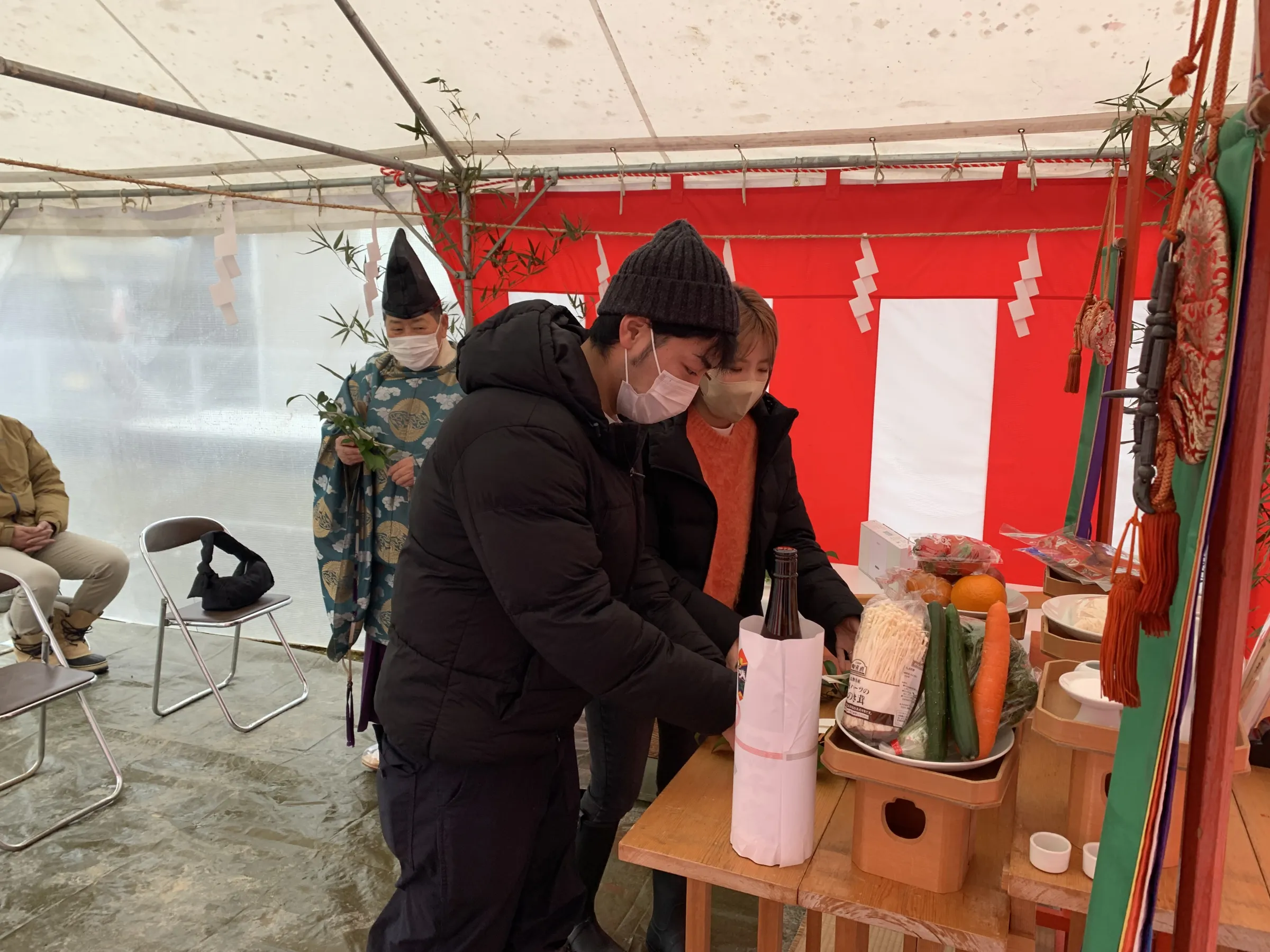 まずはこの土地の神様をお呼びする儀式を行い、建物の建つ四隅をお清めします。