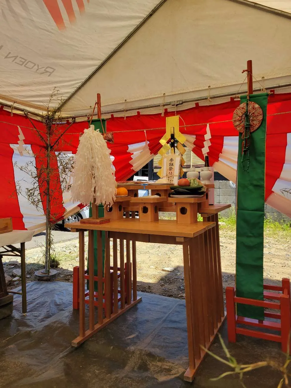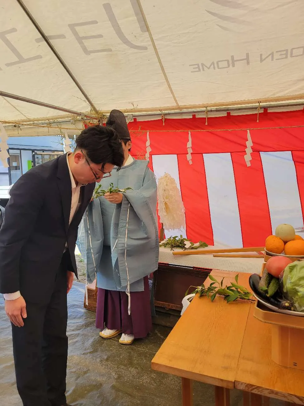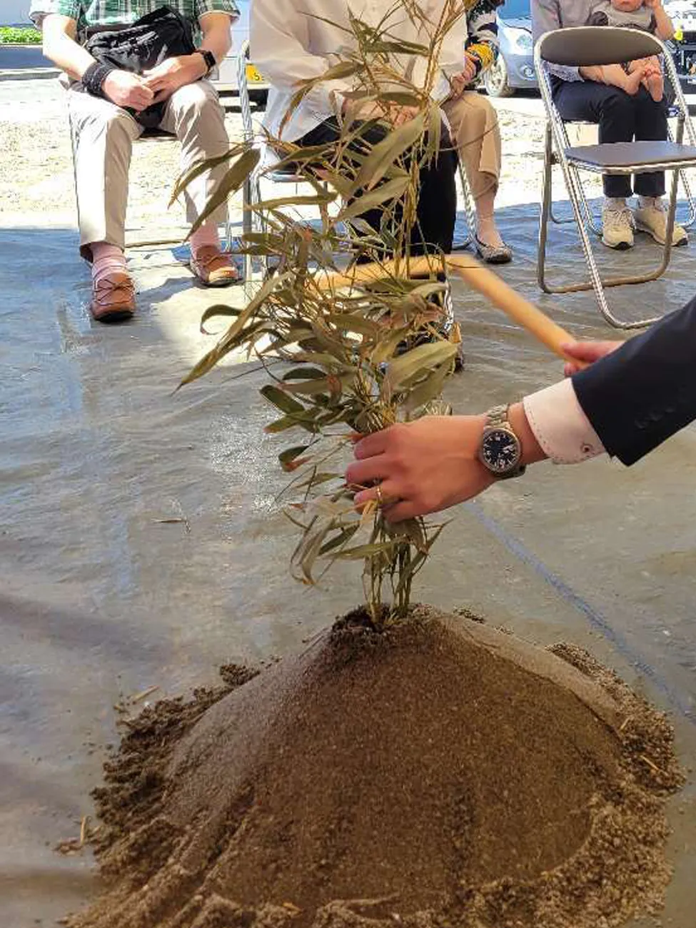 まずはこの土地の神様をお呼びする儀式を行い、建物の建つ四隅をお清めします。