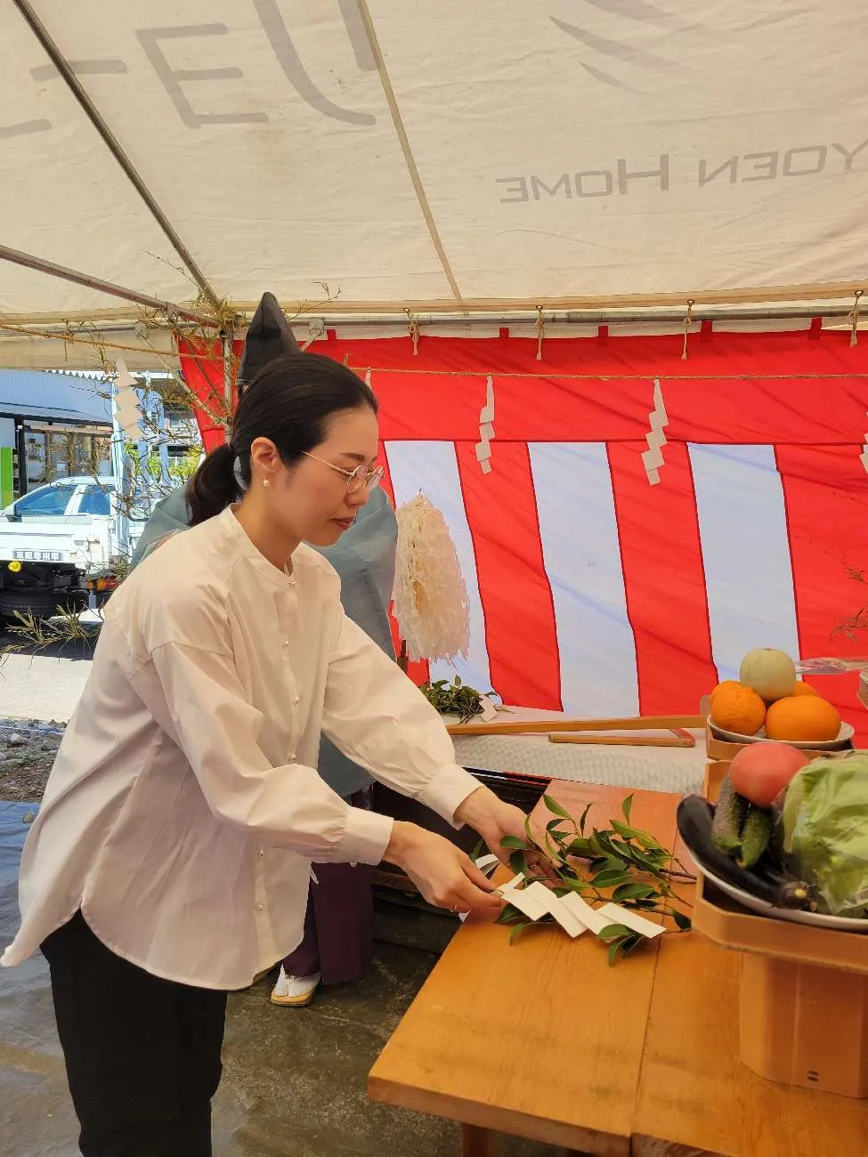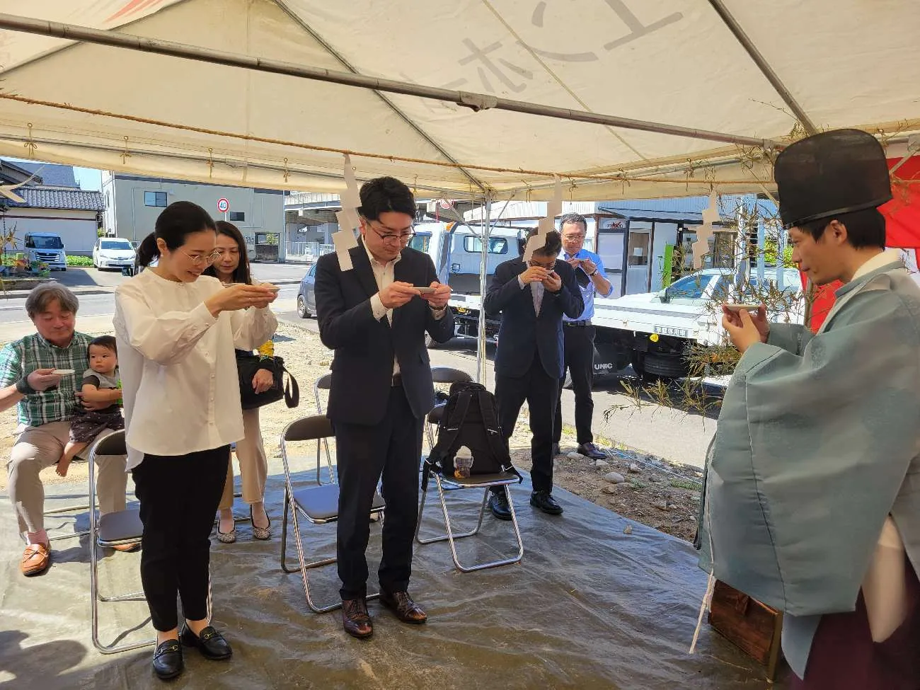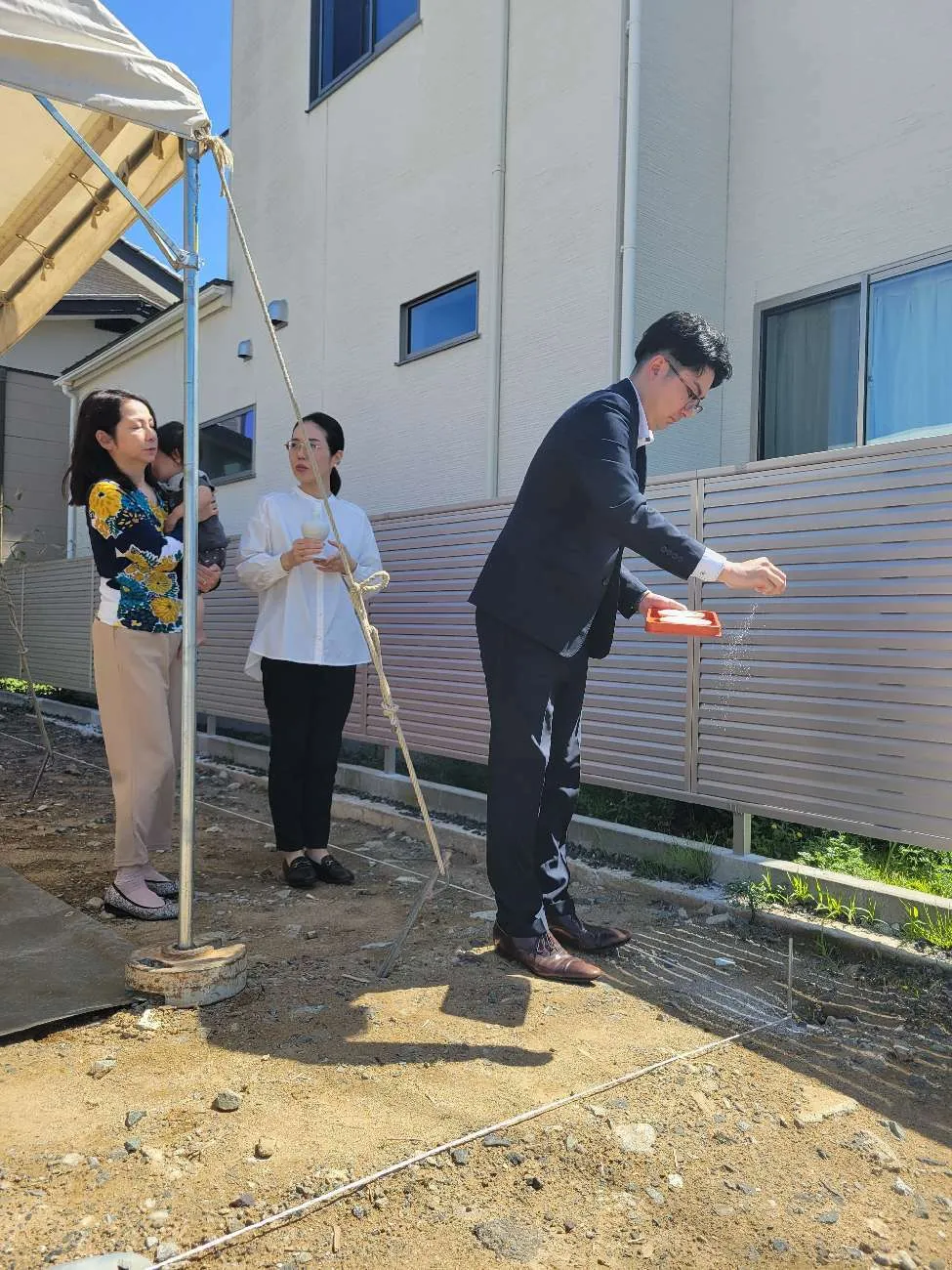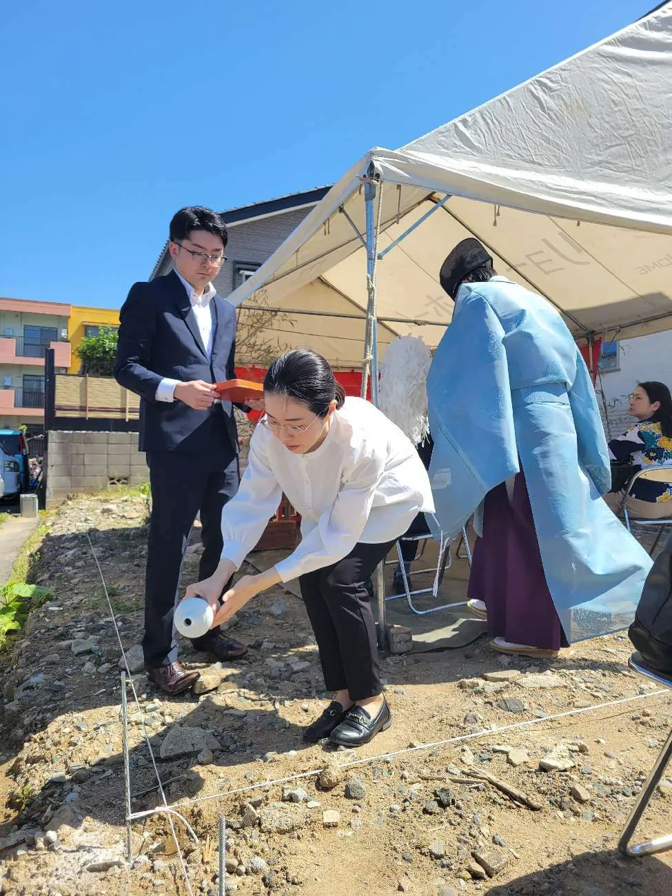 まずはこの土地の神様をお呼びする儀式を行い、建物の建つ四隅をお清めします。