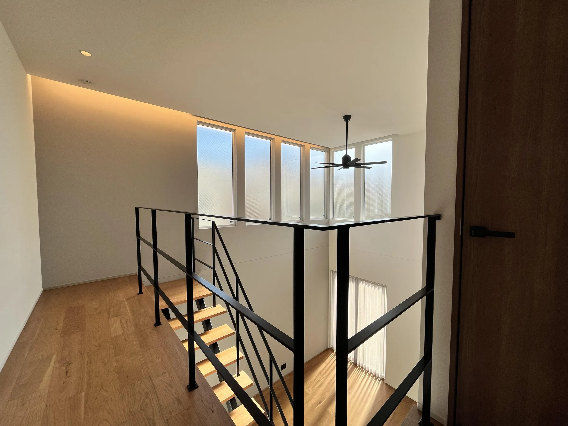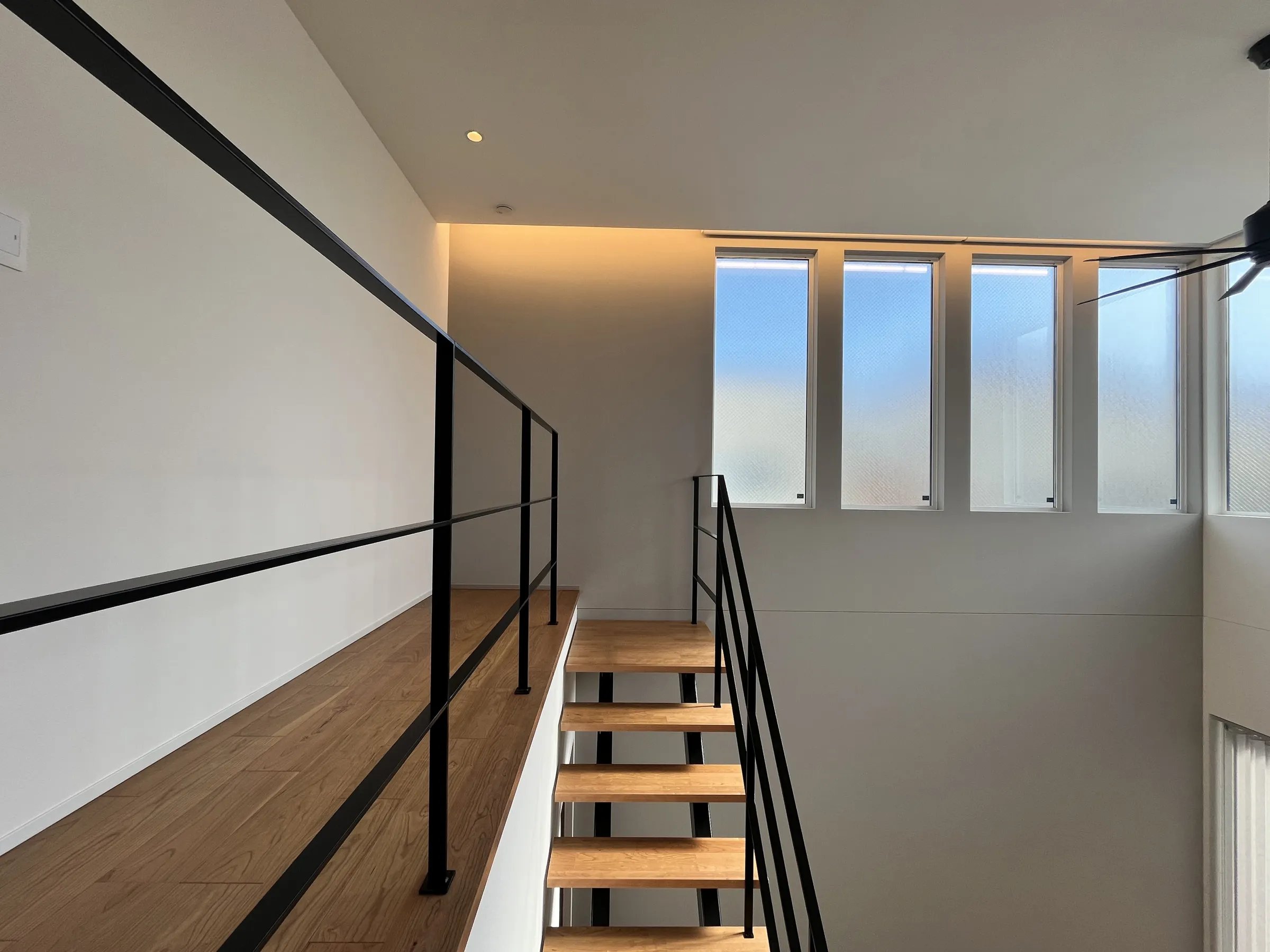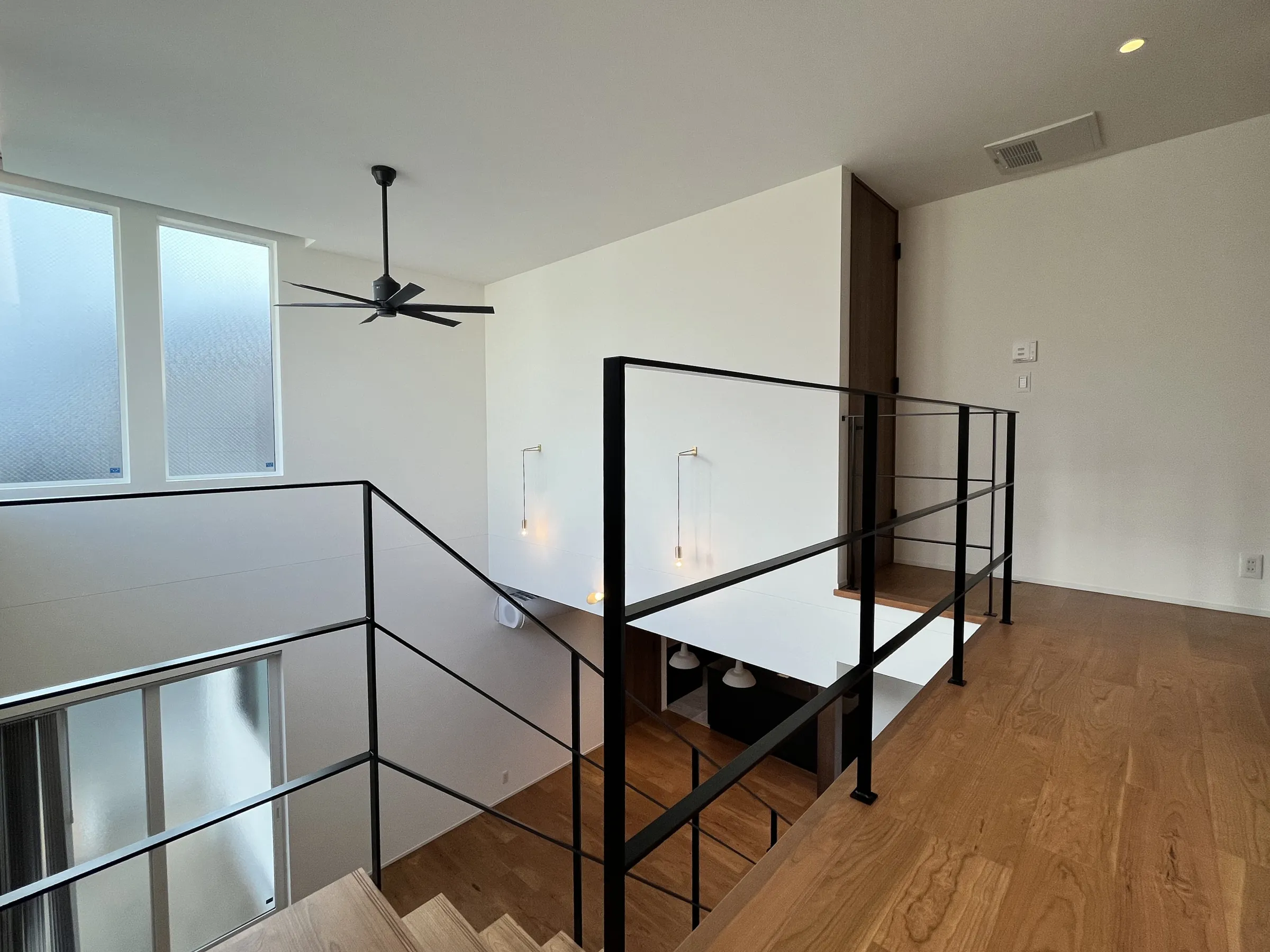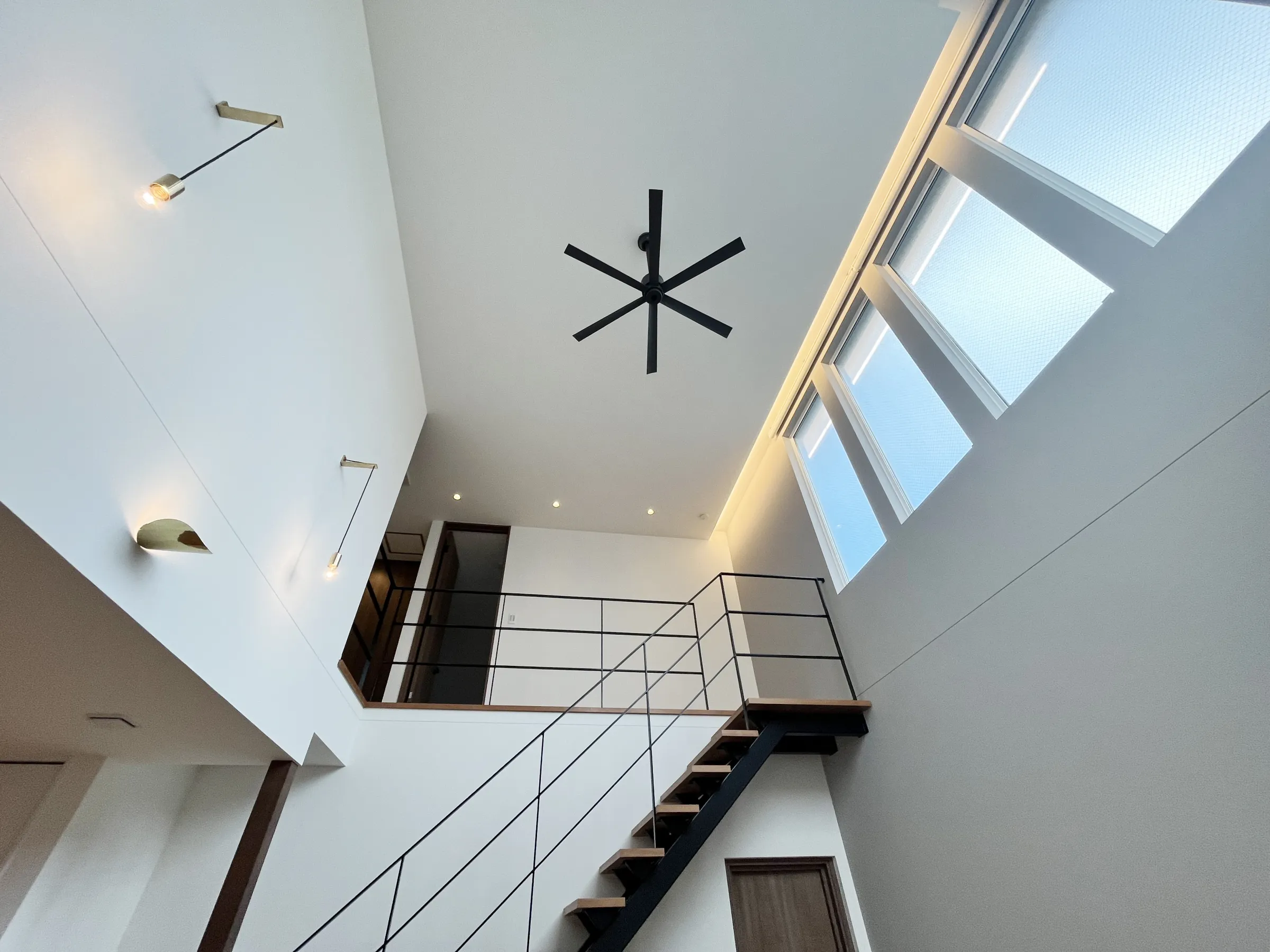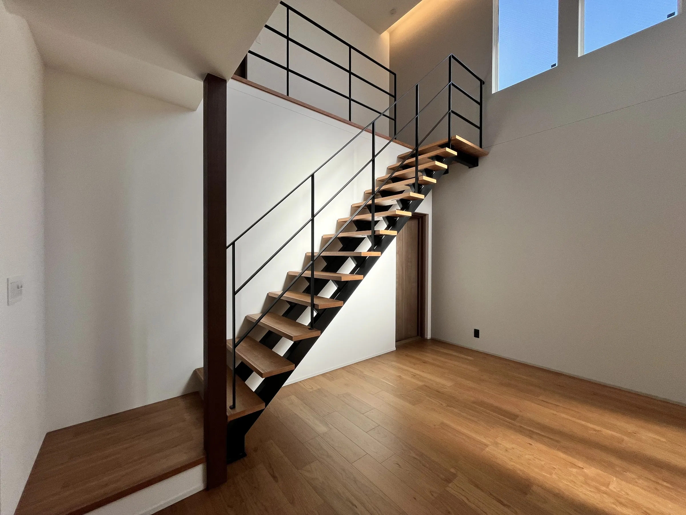大きな吹き抜けとアイアンの手すりがオシャレなシースルー階段で、明るく開放的なLDK。