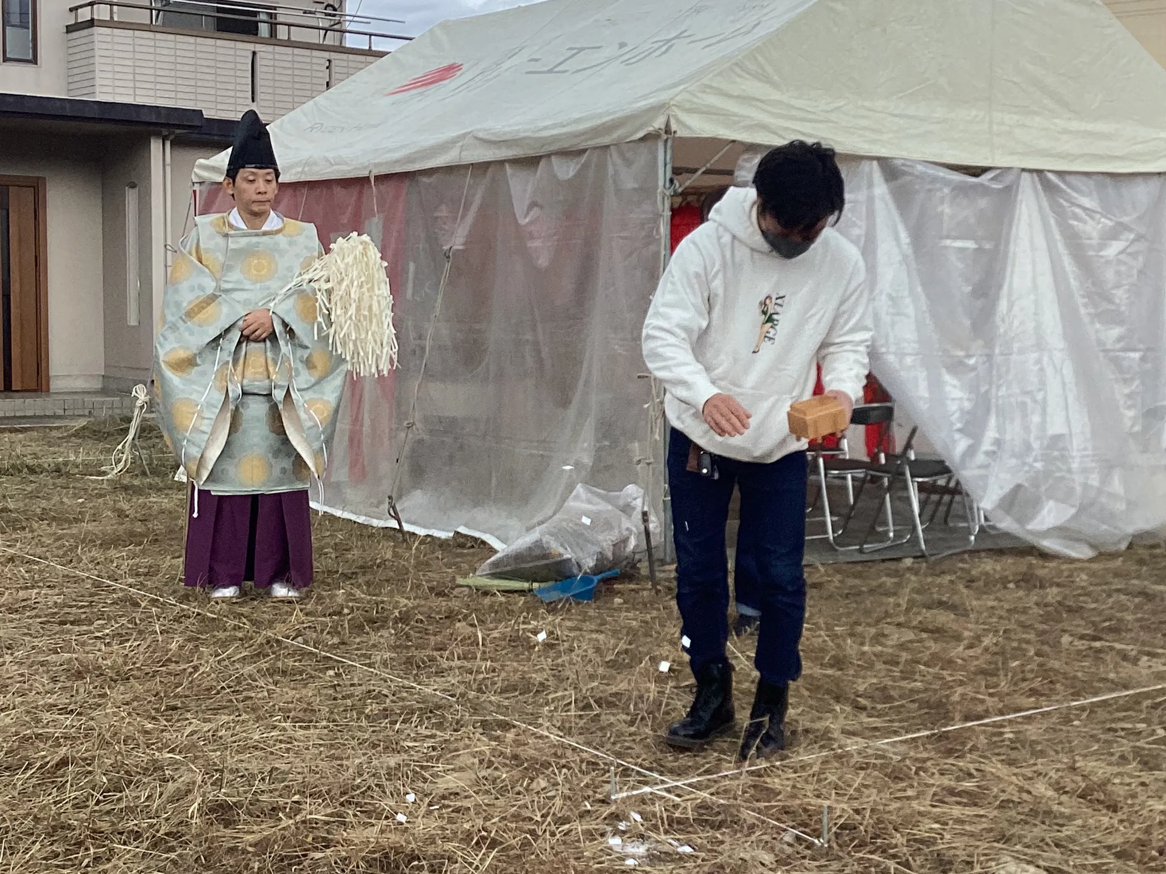まずはこの土地の神様をお呼びする儀式を行い、建物の建つ四隅をお清めします。