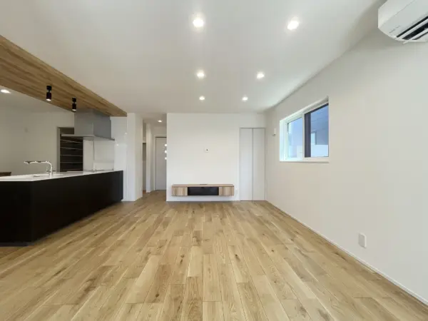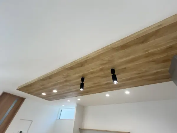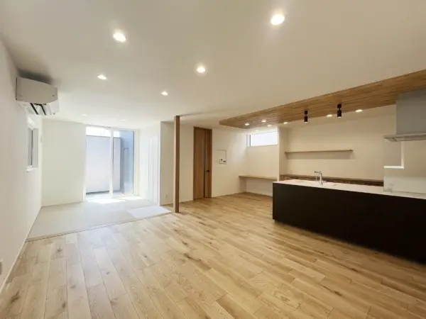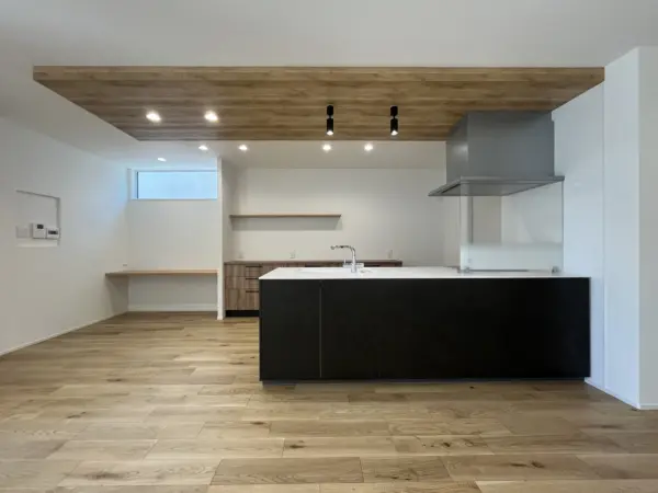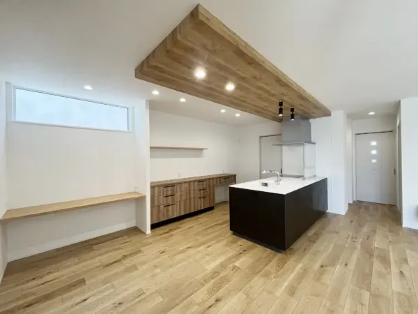 キッチンの下がり天井が特徴的なLDK。キッチン横にはスタディコーナーがあります。