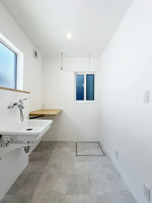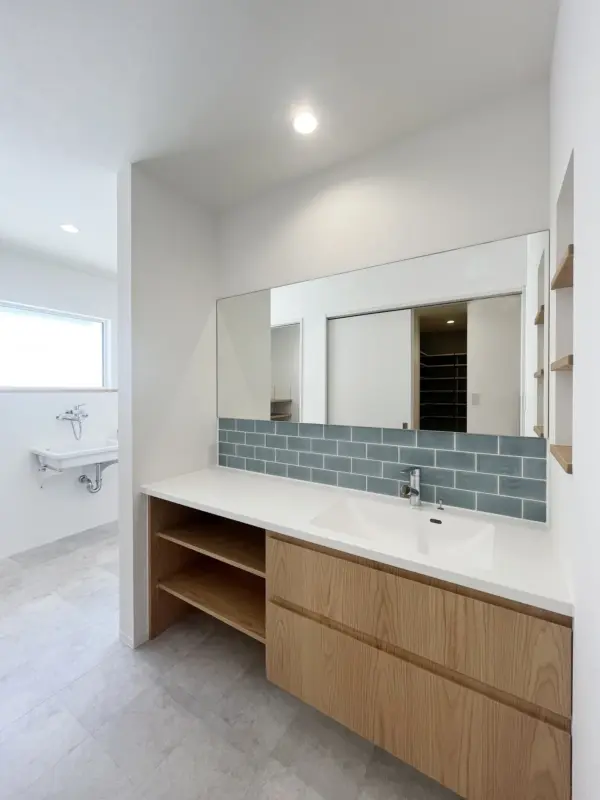ブルーのタイルで彩った洗面台はアイカのスマートサニタリーから。水回りがまとまった家事動線を確保しています。