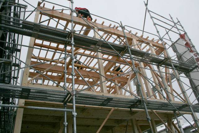 柱や梁を2階の屋根部分まで組み上げたら、