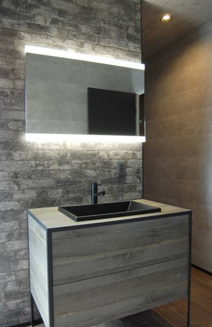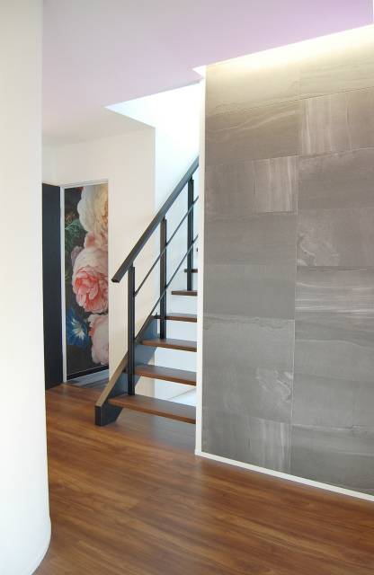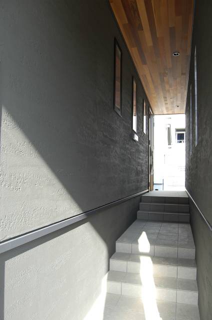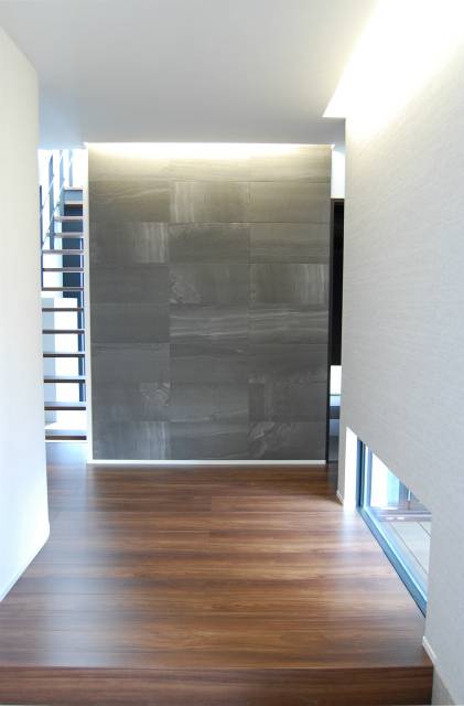 スリット階段からの光や間接照明で明るさが工夫されています。