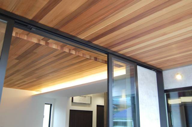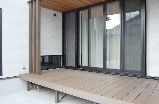 リビングの天井とウッドデッキ部分の軒裏は木調で統一。内と外のつながりを演出しています。