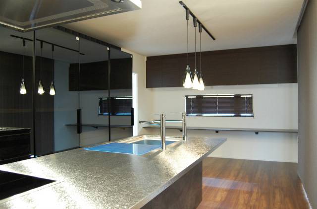 シックな色合いのキッチンとガラス扉のキャビネットが高級感のある空間を演出します。