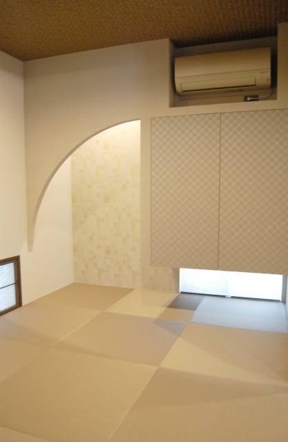 床の間はフラットになっていて、アールの壁が優しい印象に。収納は吊り押入れとなっており、お布団などをきちんと収納しつつも、建具を浮かすように見せることで、和の空間を軽やかにします。