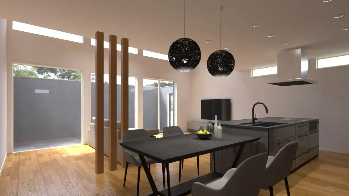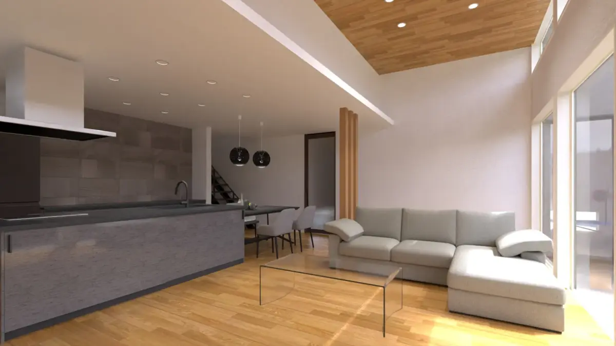 天井高3.5mの大空間が広がる約25帖のLDK。バス・洗面・ランドリールーム・ファミリークロークがまとまって配置され、家事楽な動線を確保。パントリーをはじめ広々とした収納スペース、雨の日も濡れずに車の乗り降り可能なインナーガレージ、リビングからつながるタイルテラスなど、日々を大切にする暮らしを営む工夫が満載の間取りとなっています。